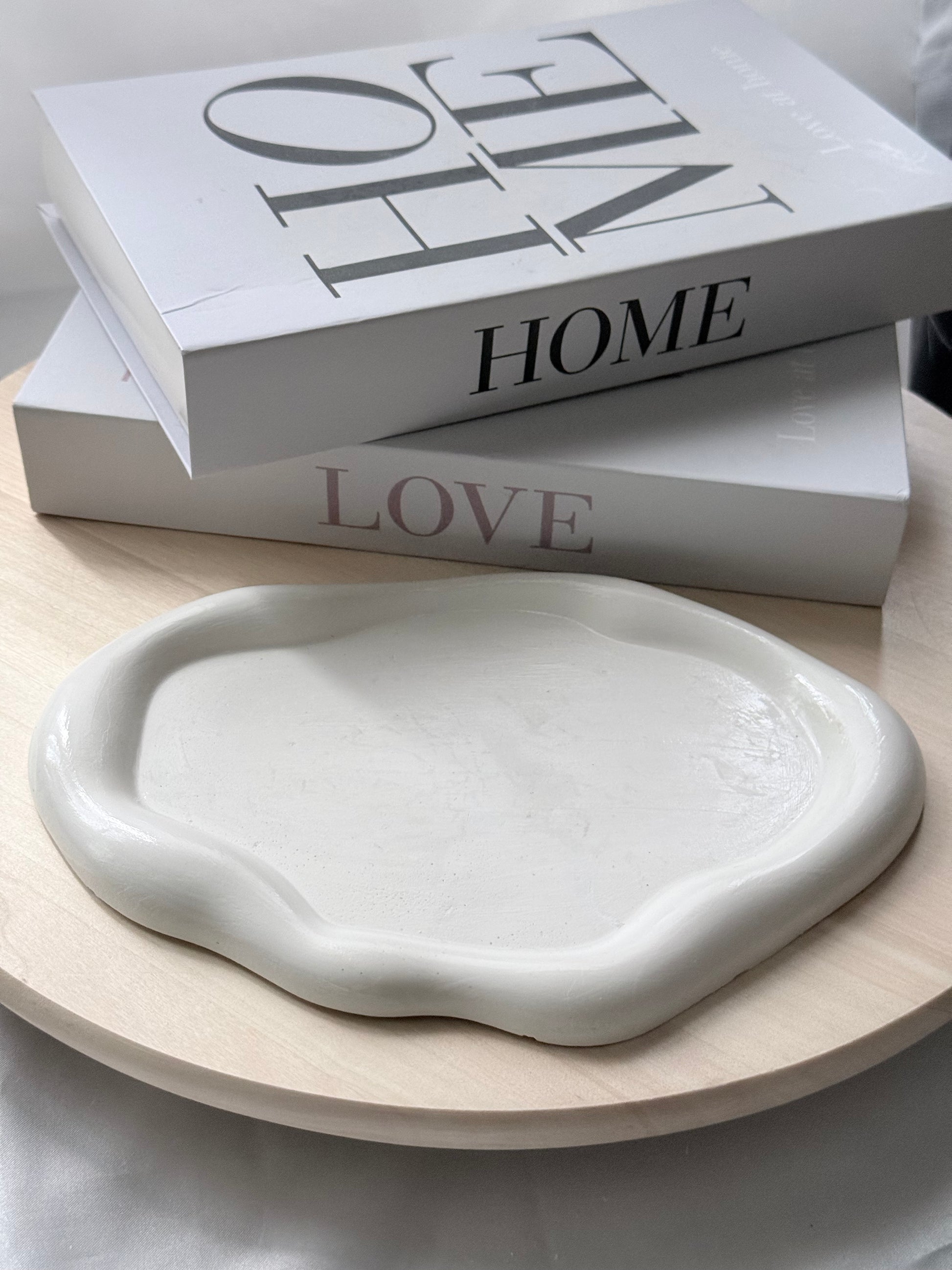 Bandeja artesanal en acabado blanco con forma ovalada y bordes orgánicos. Ideal para usar como base decorativa, porta velas, soporte para wax melts o simplemente como pieza de estilo minimalista que aporta elegancia y serenidad a cualquier espacio.