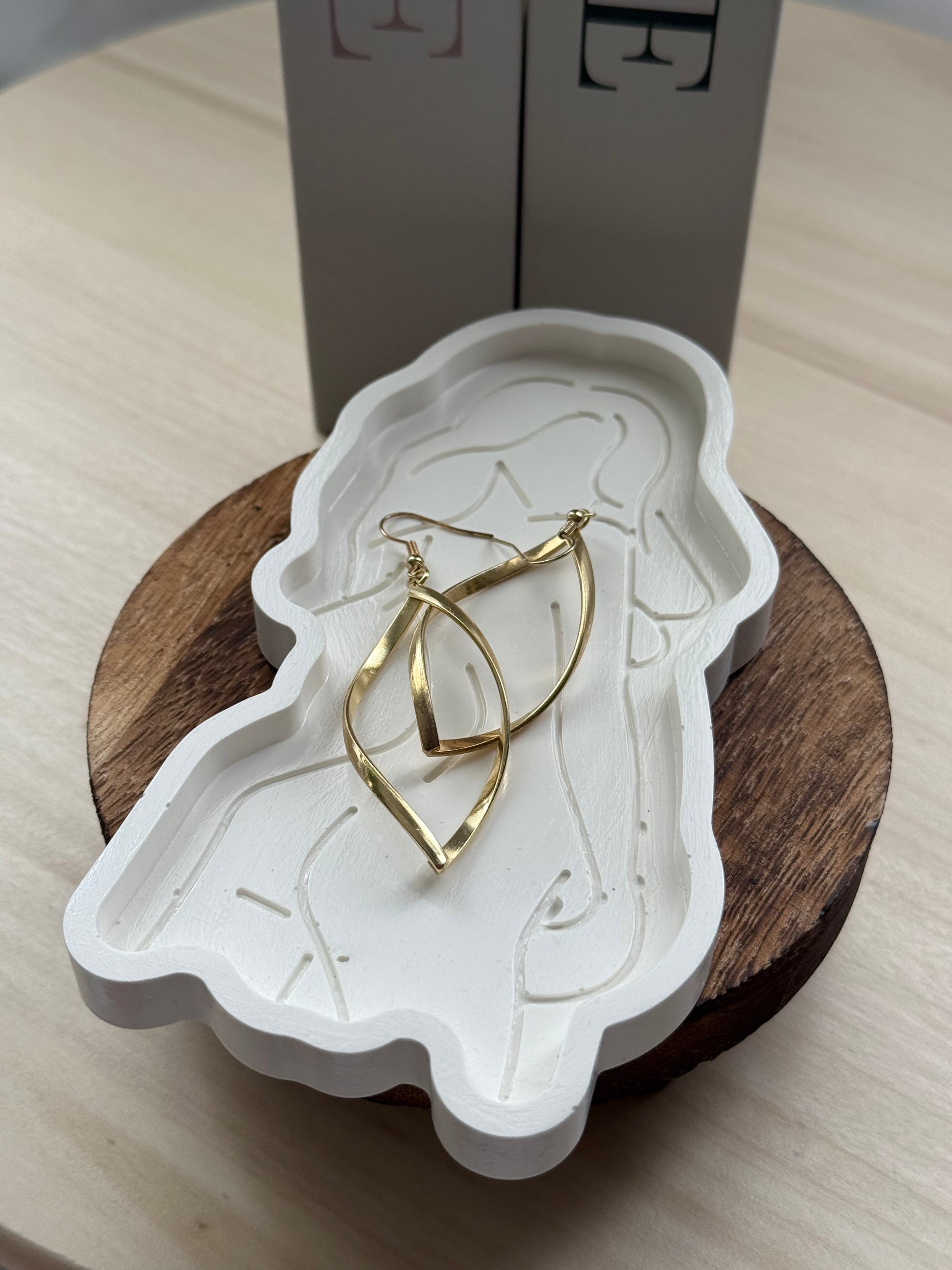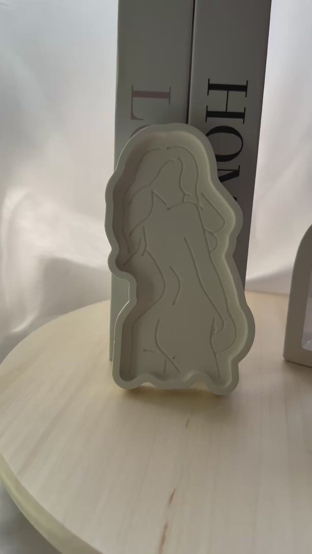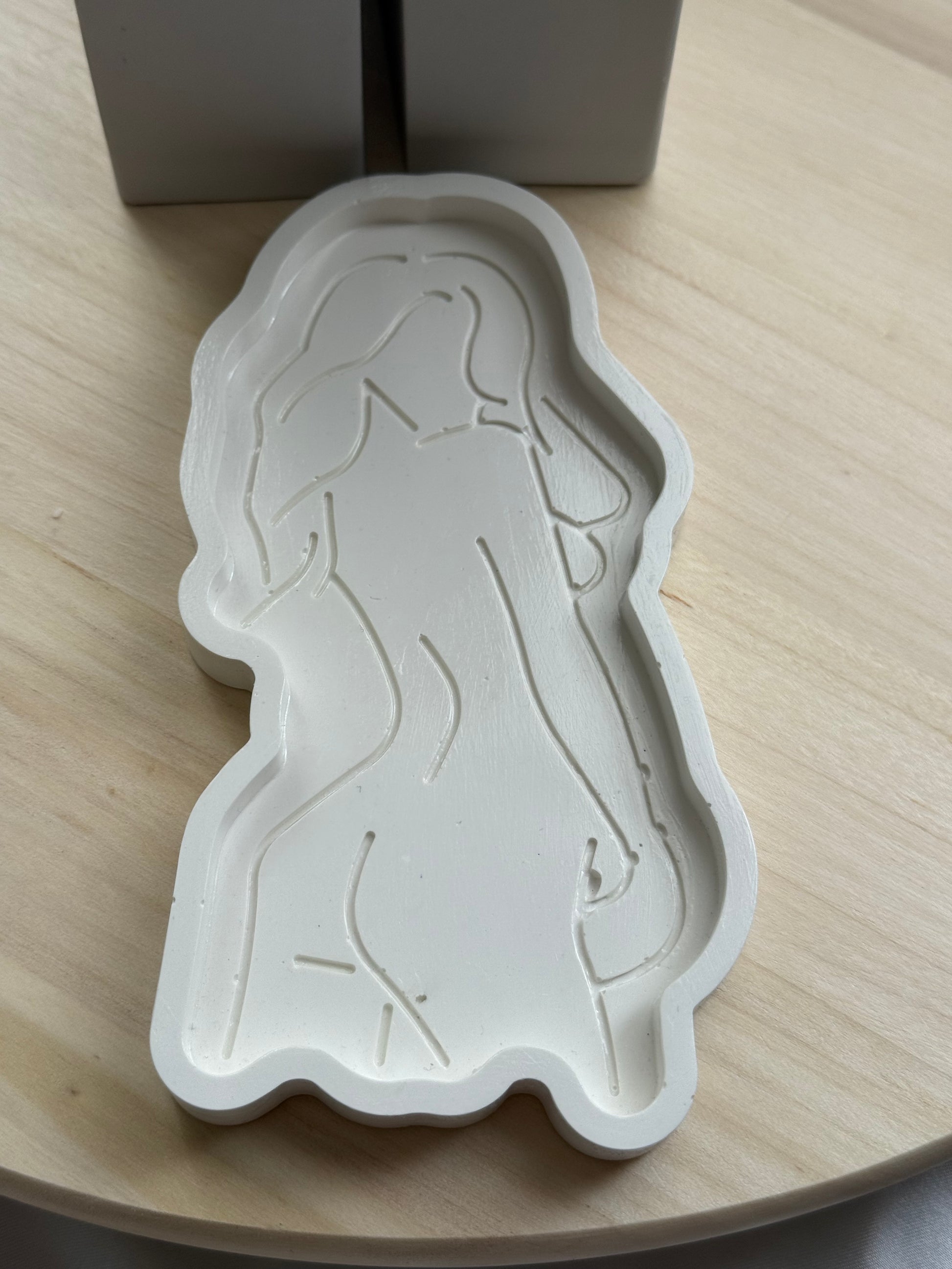 Bandeja decorativa en tono blanco con diseño minimalista en relieve de la silueta femenina. Ideal para usar como organizador de accesorios pequeños o como pieza decorativa moderna y elegante.