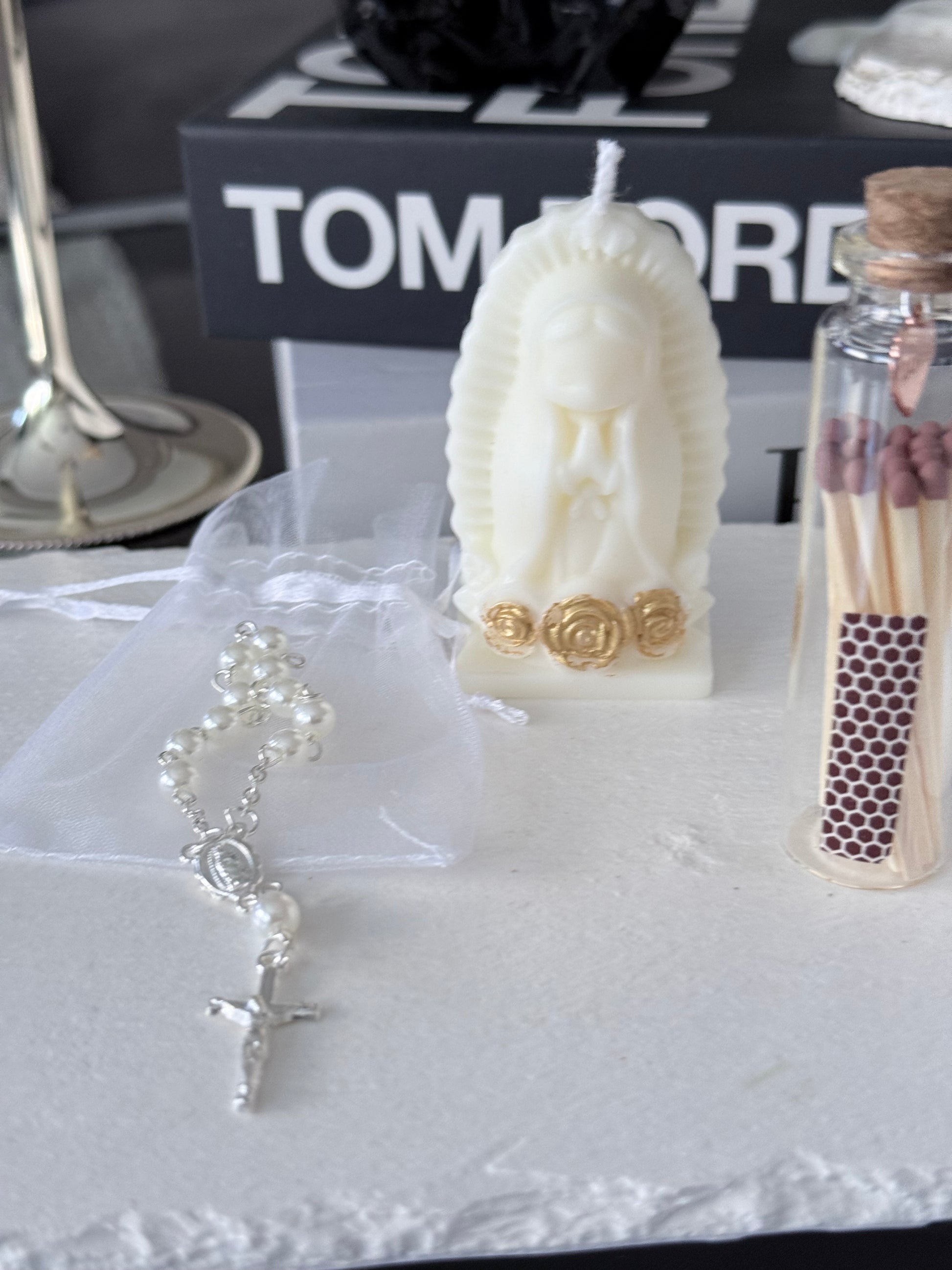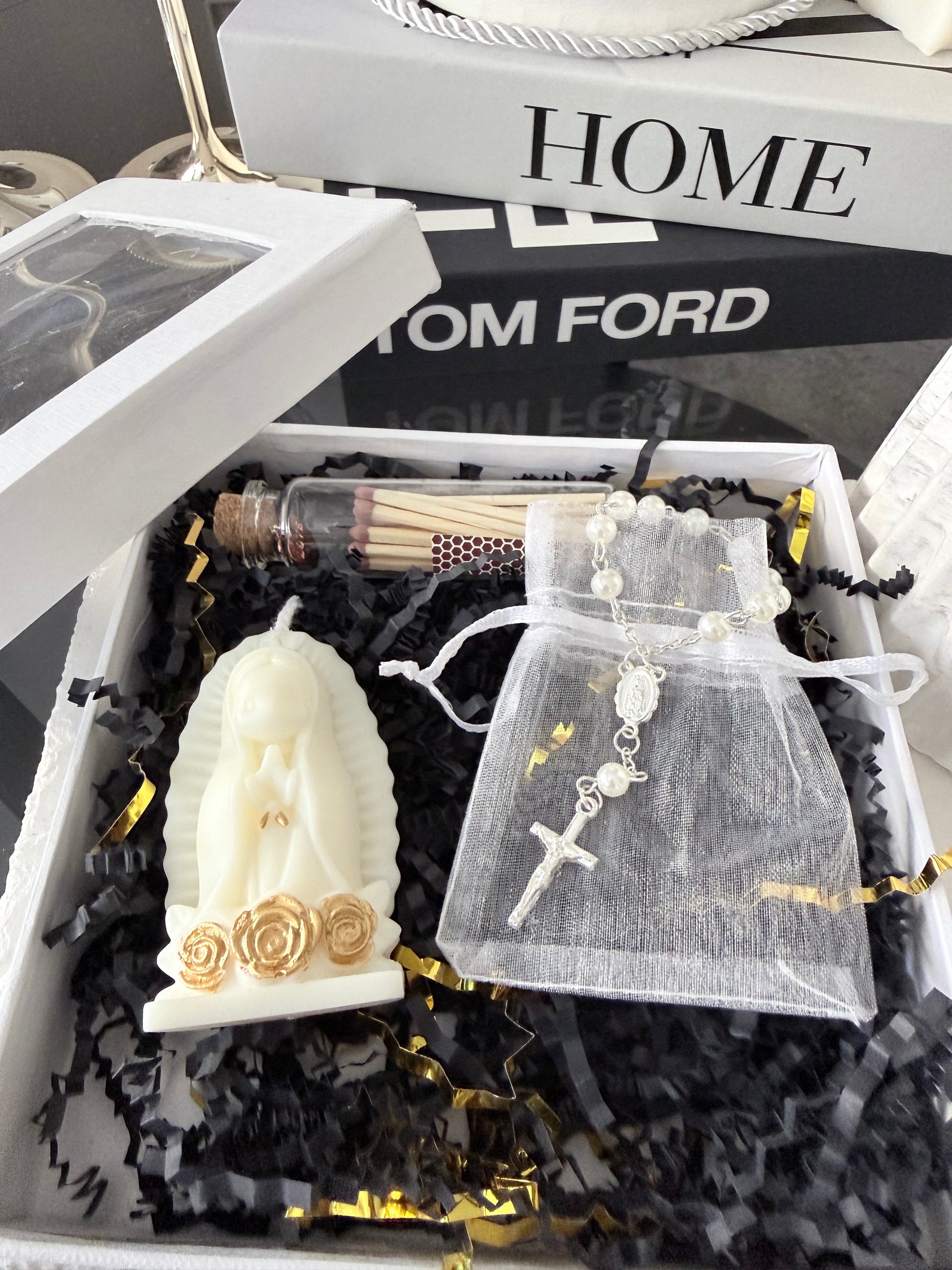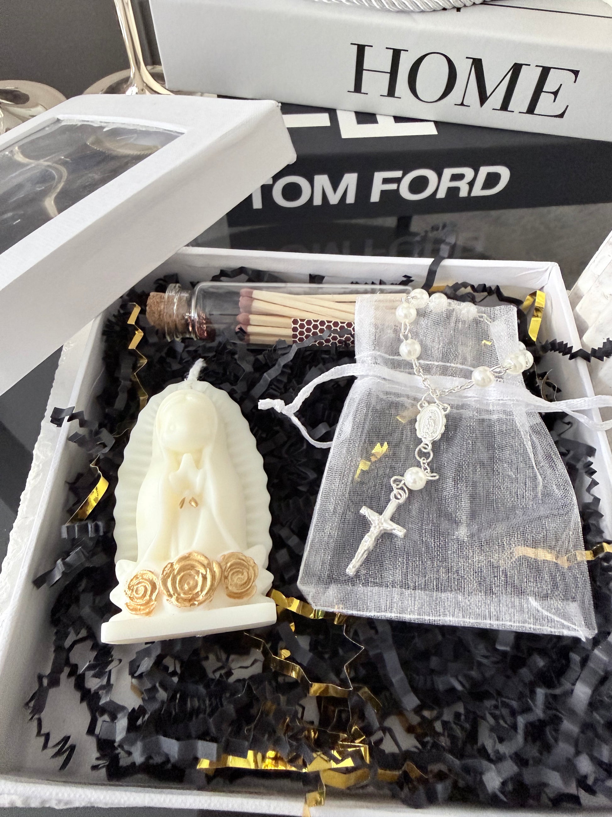 Esta caja incluye una vela artesanal con figura sagrada, un rosario decorativo y cerillas en frasco de cristal, creando un conjunto perfecto para momentos de calma, fe y conexión interior.