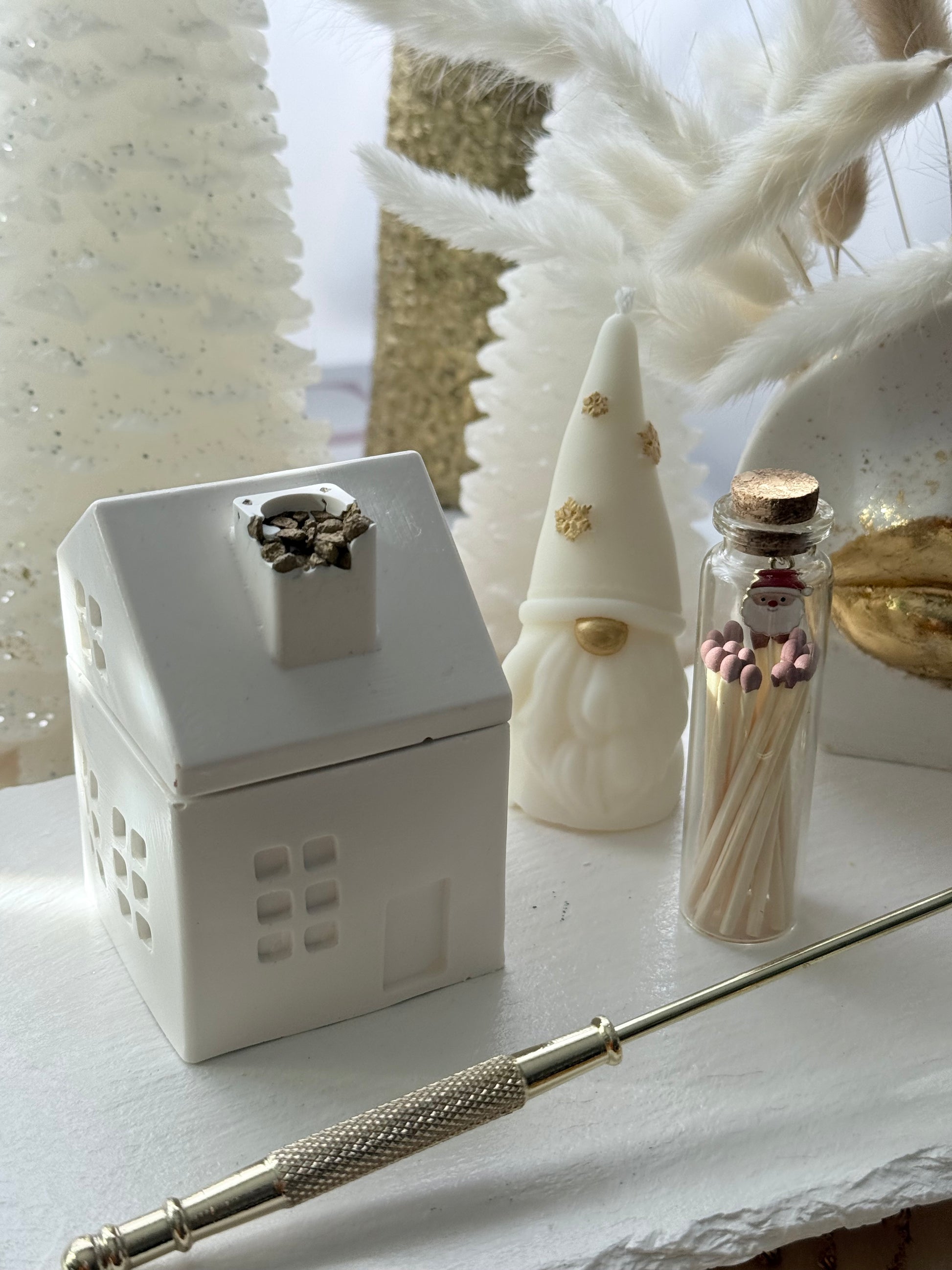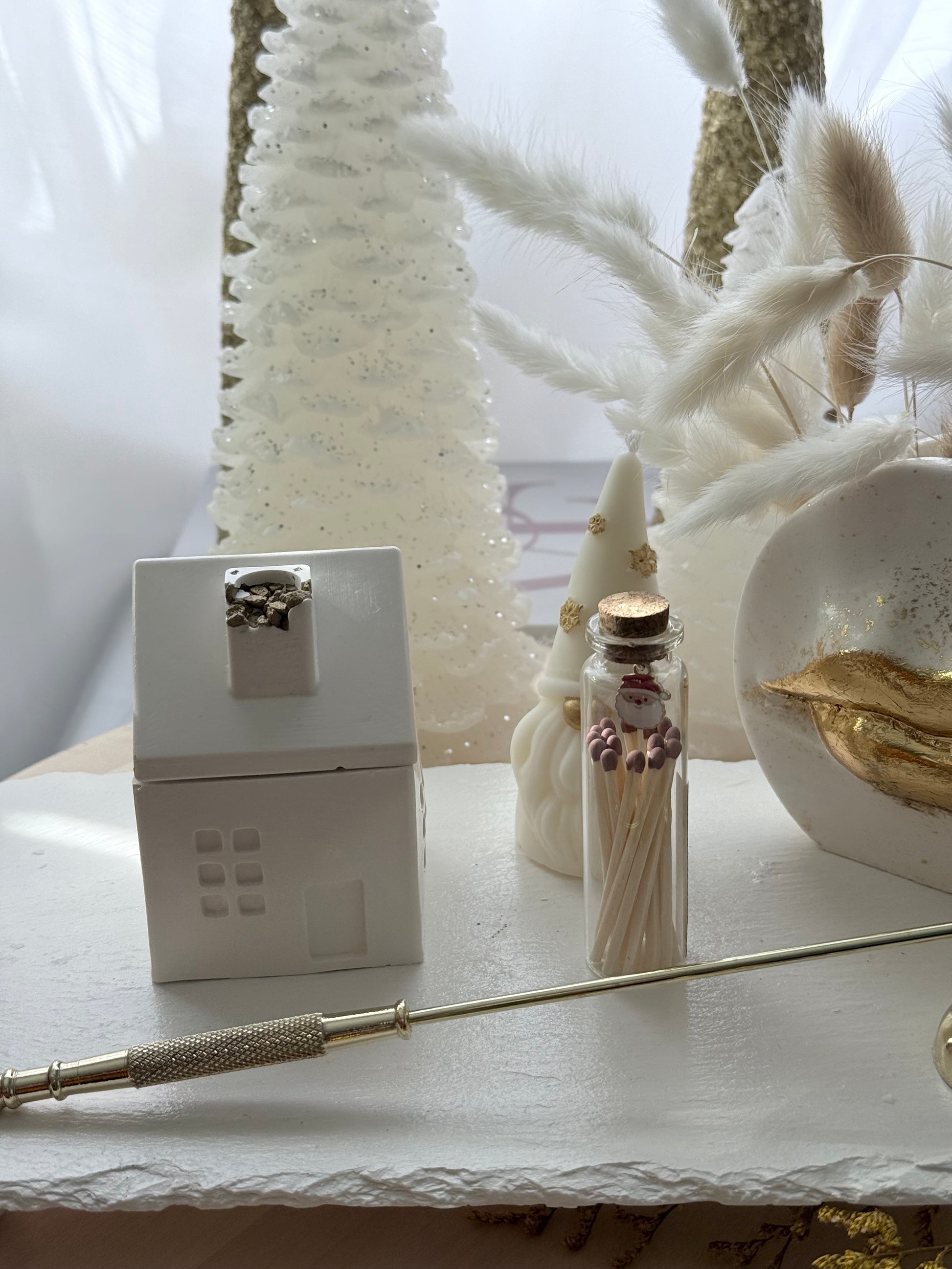 Una delicada casita blanca que guarda en su interior una vela aromática, acompañada de su tapa decorada con pequeñas piedras naturales. La escena se rodea de detalles invernales: árboles blancos con acabado escarchado, un tierno adorno navideño y accesorios que completan un ambiente cálido y sofisticado. Esta pieza minimalista es perfecta para aportar luz, serenidad y encanto estacional a cualquier rincón de tu hogar.