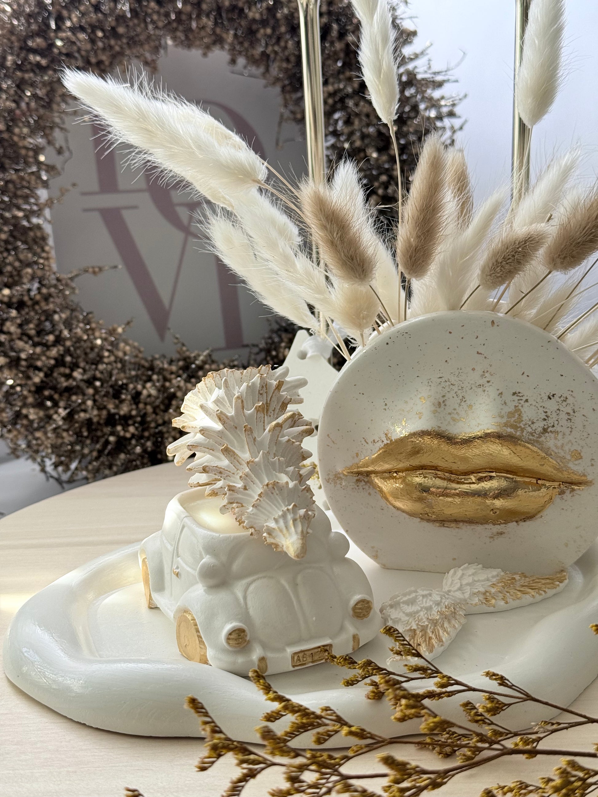 Una vela navideña única, moldeada en forma de coche de resina blanca con elegantes detalles dorados. Su diseño evoca la magia de la Navidad con un estilo moderno y sofisticado. Acompañada de tonos cálidos y destellos dorados, esta pieza decorativa ilumina cualquier rincón con un espíritu festivo, elegante y lleno de encanto invernal. Ideal para crear ambientes acogedores durante las celebraciones navideñas.