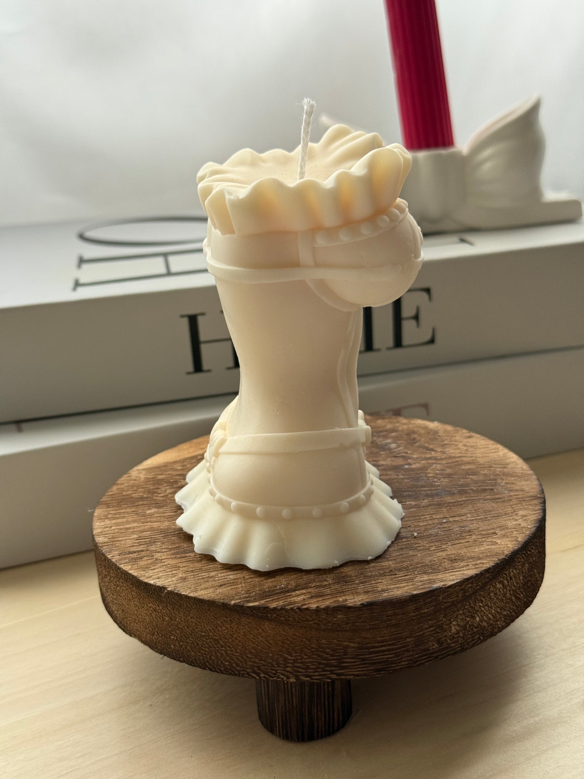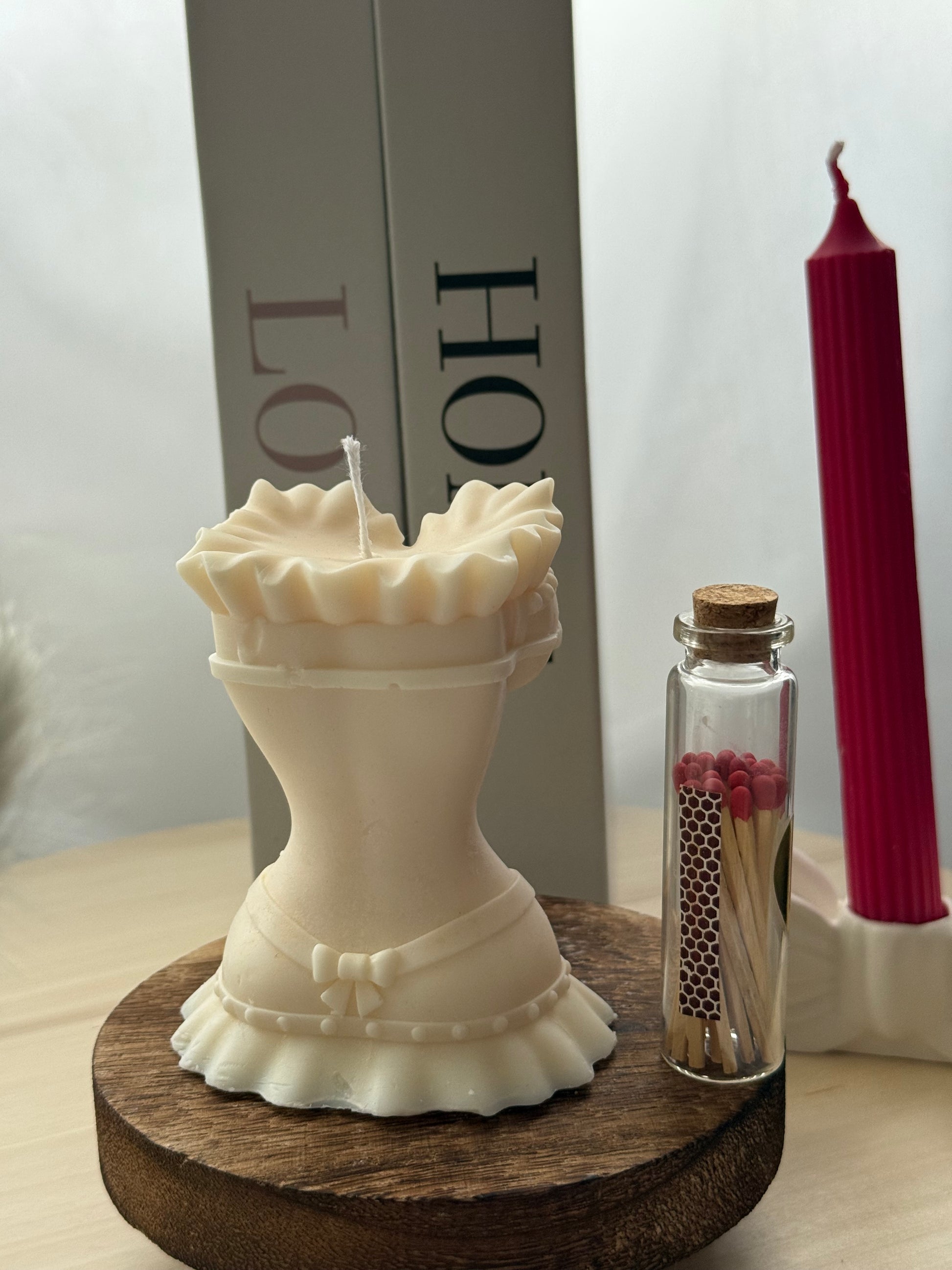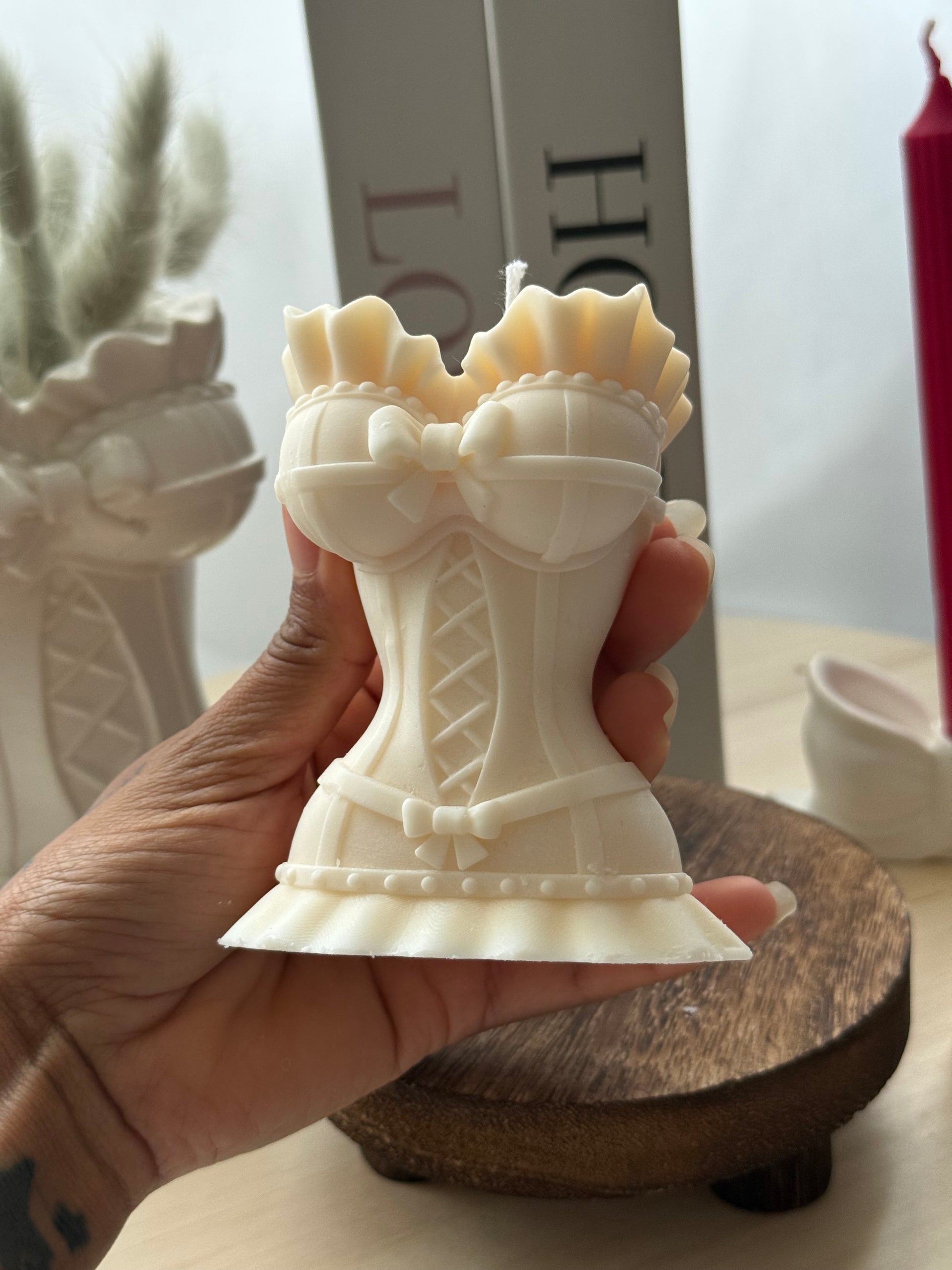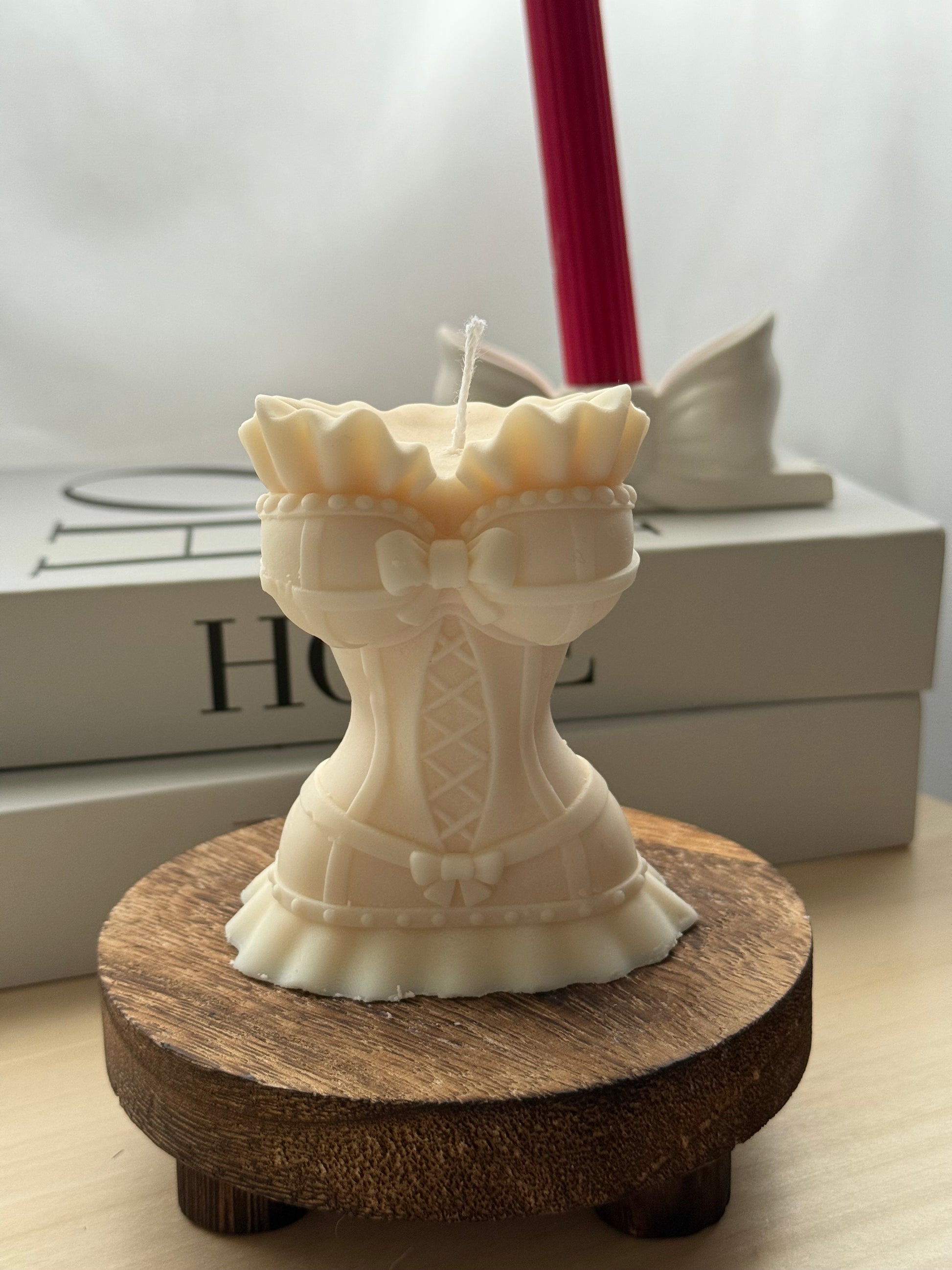“Vela artesanal en forma de corset, diseñada para transmitir feminidad, sofisticación y un toque romántico. Hecha a mano con delicados detalles que la convierten en una pieza decorativa única, perfecta para aportar elegancia y estilo a cualquier rincón de tu hogar.”