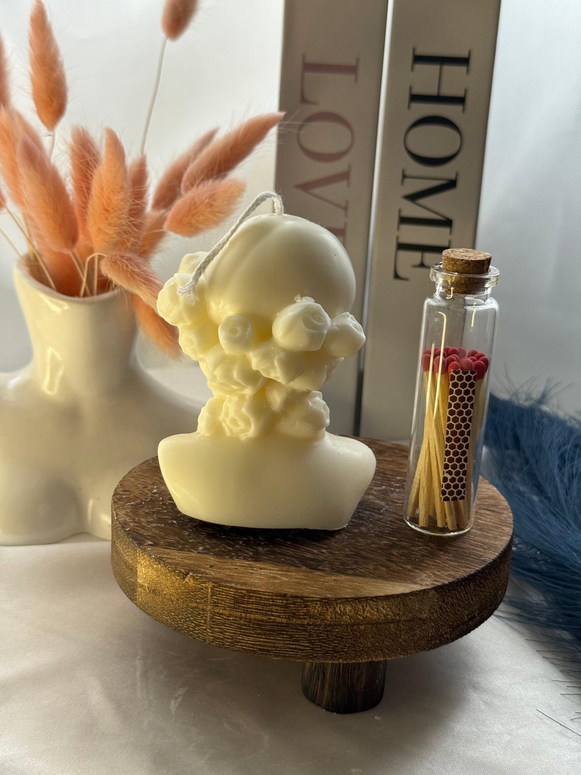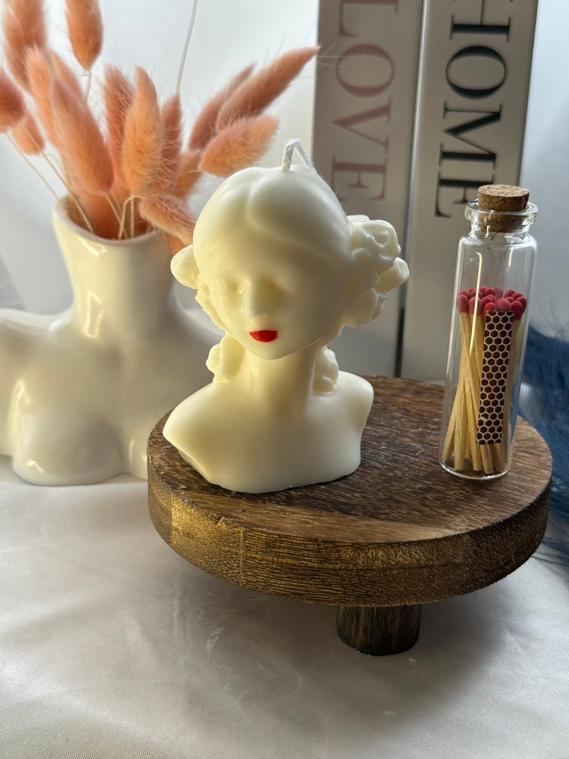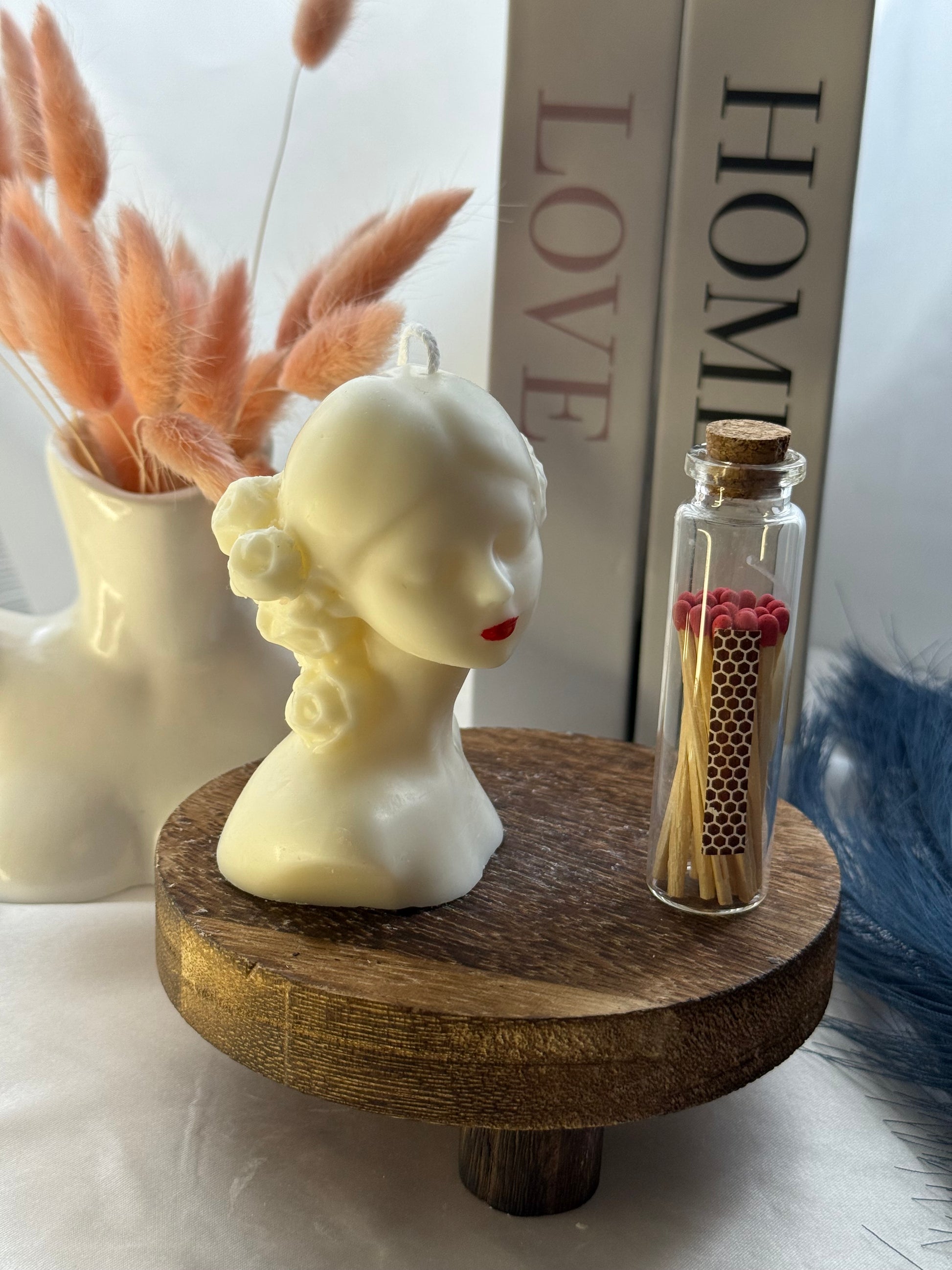 Obra artesanal en cera fina, con delicadas facciones femeninas que evocan elegancia y sofisticación. Una pieza decorativa que ilumina y embellece cualquier ambiente con distinción.