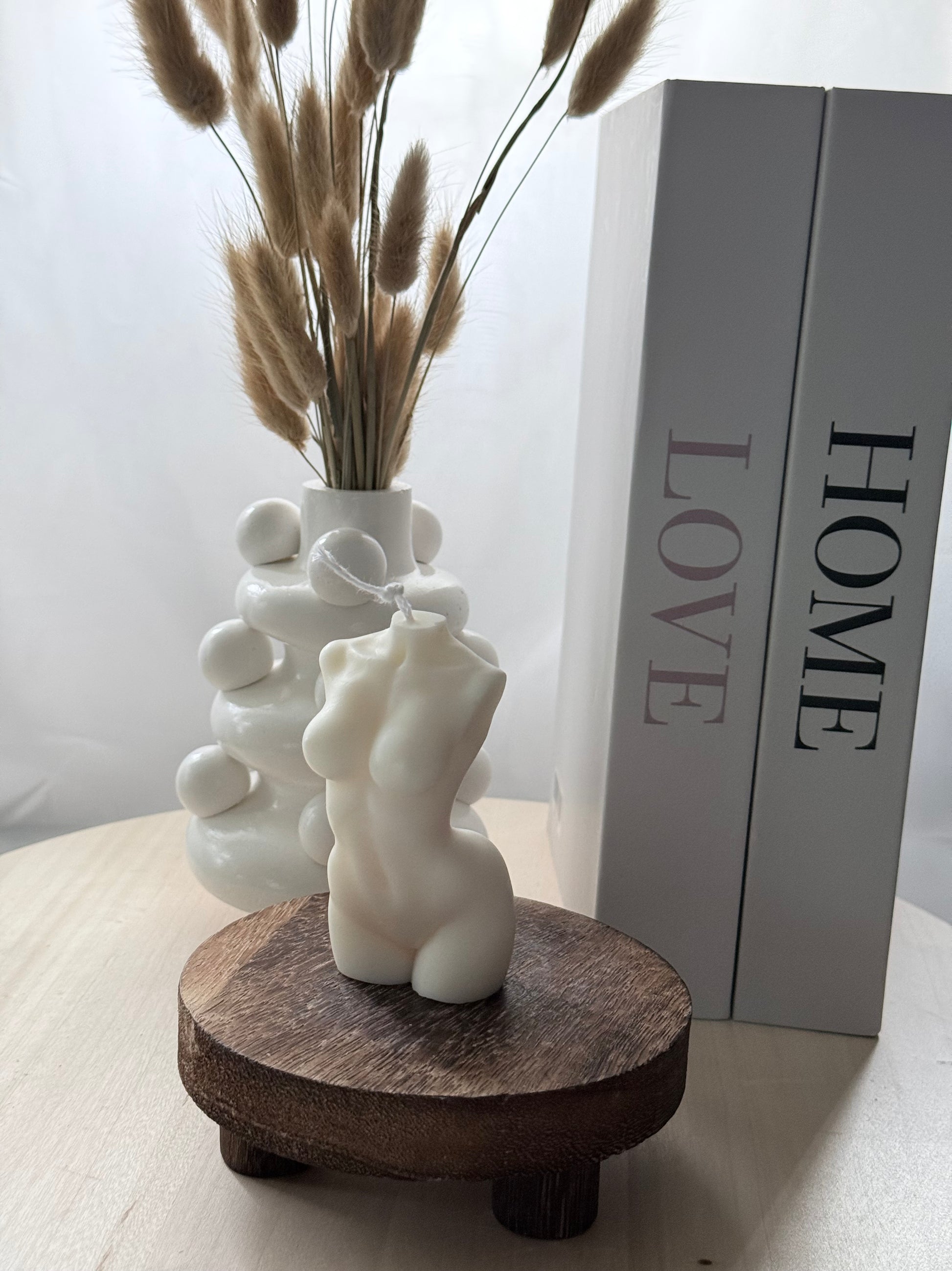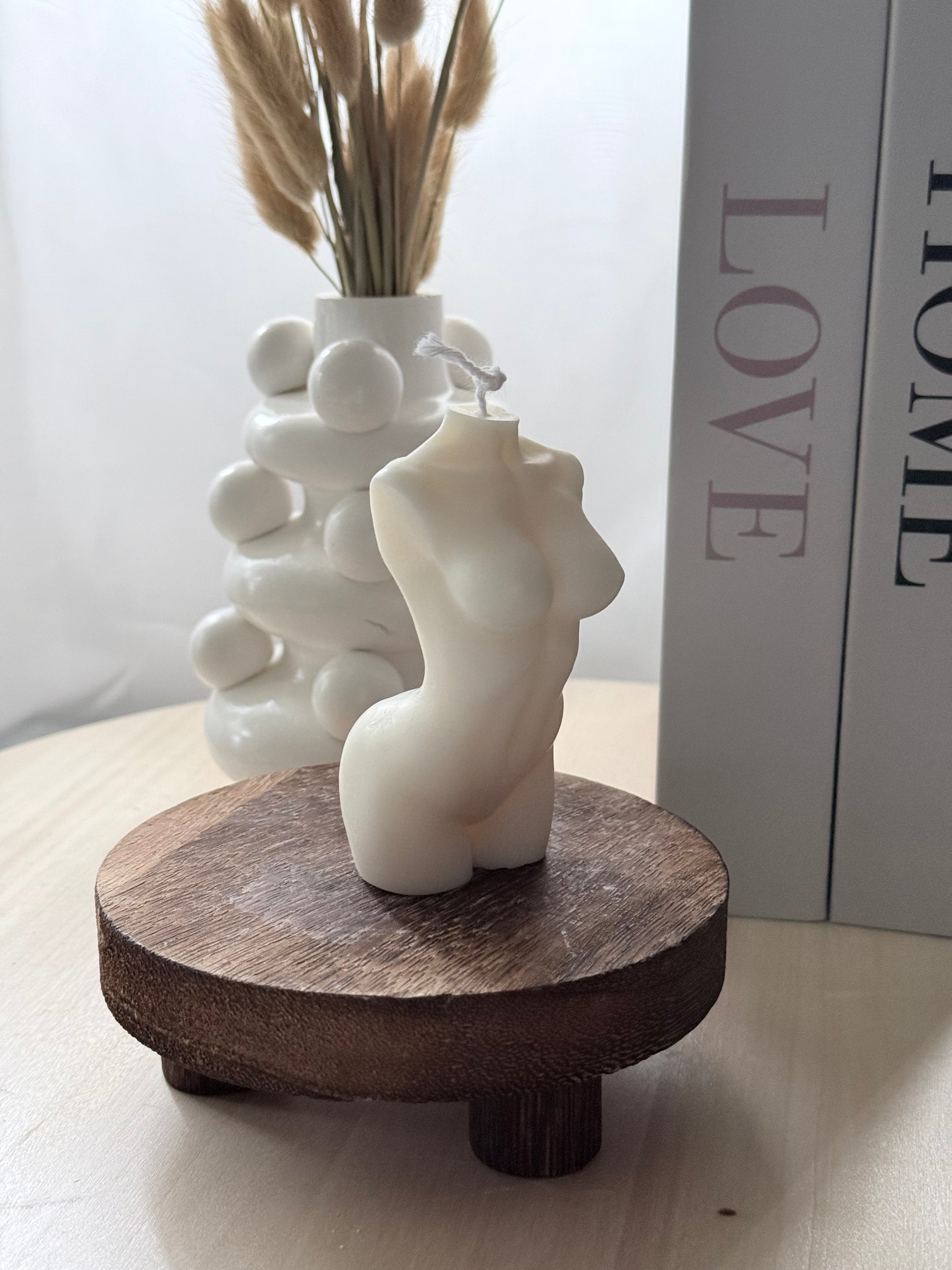 Una vela artesanal que celebra la belleza y la esencia del cuerpo femenino. Su diseño minimalista y elegante simboliza amor propio, fortaleza y feminidad, convirtiéndose no solo en una pieza aromática, sino también en un objeto decorativo lleno de significado.