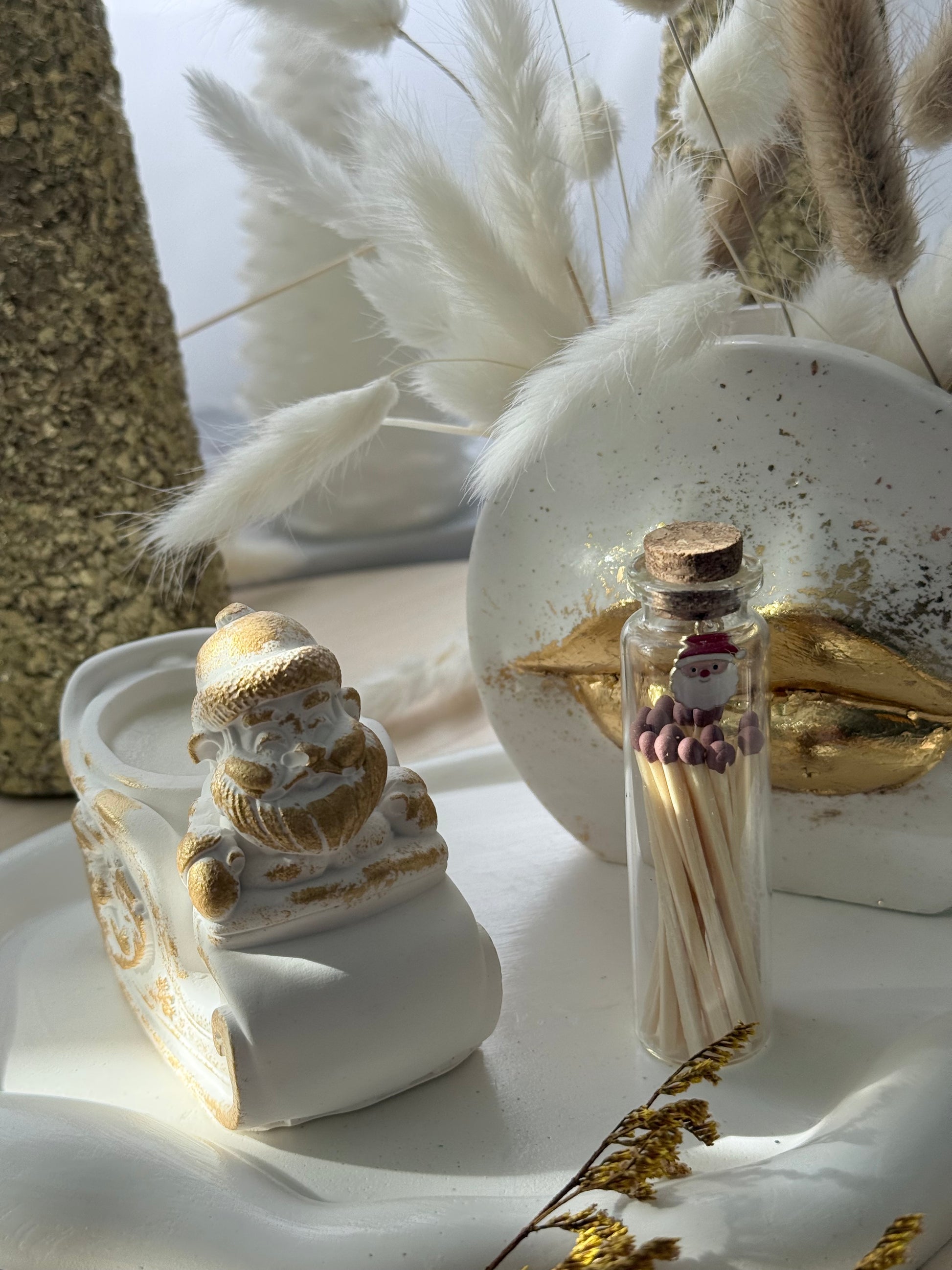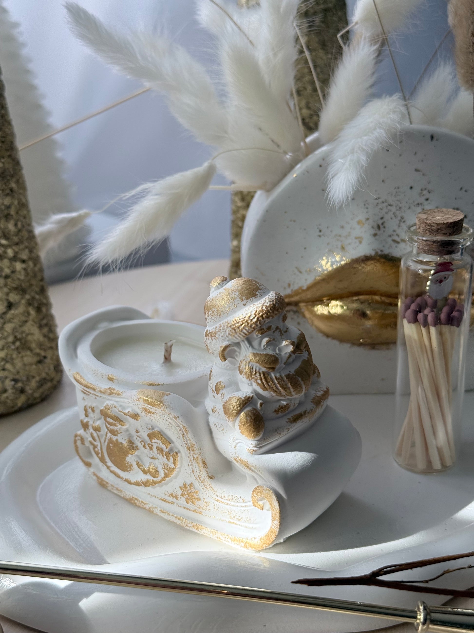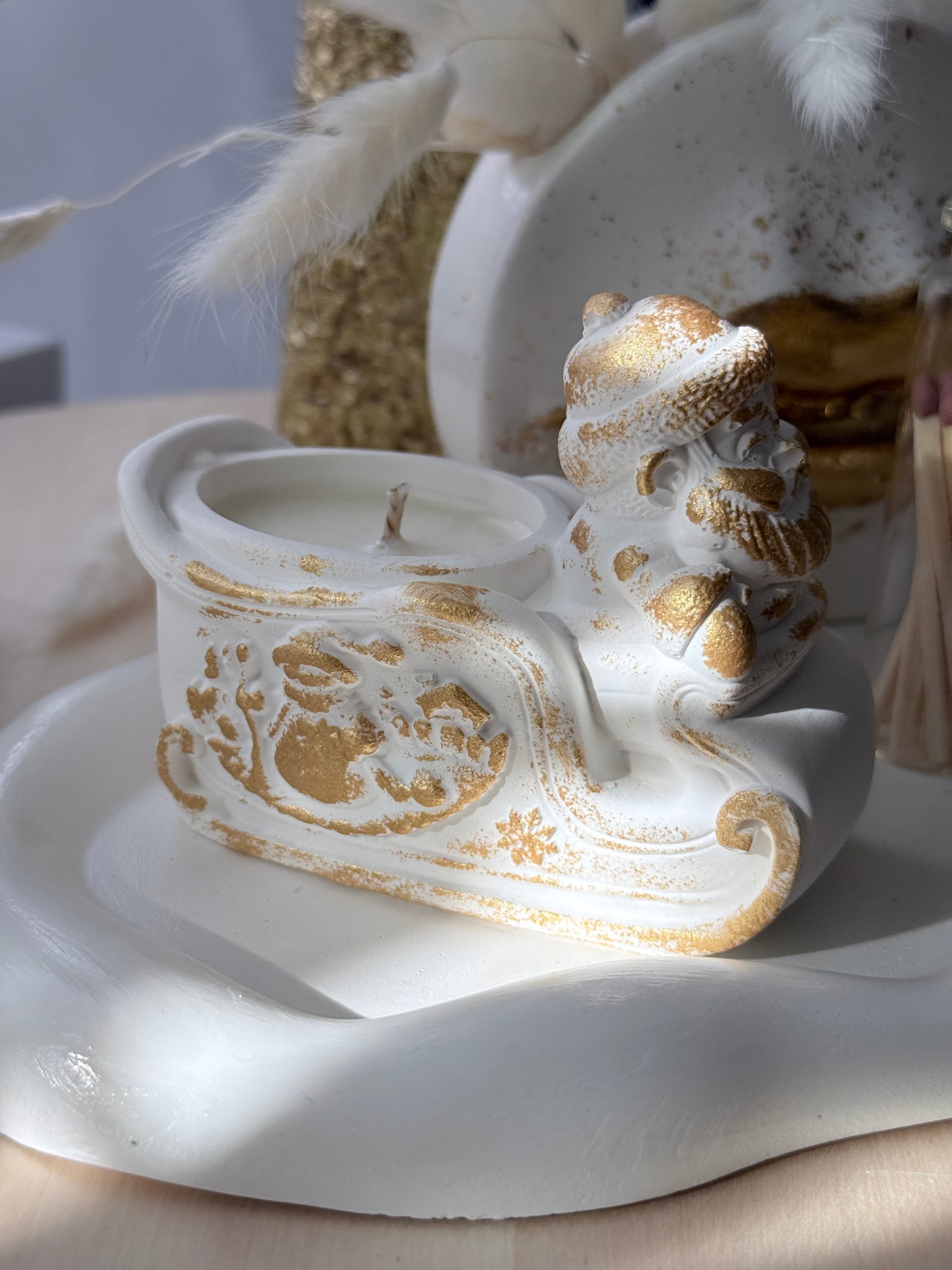 Un delicado portavelas en forma de trineo, realzado con suaves pinceladas doradas, captura la luz y la transforma en un destello cálido y artesanal. La figura clásica y los detalles ornamentales evocan una atmósfera festiva y serena, creando un pequeño rincón donde la elegancia y la nostalgia se encuentran en perfecta armonía.