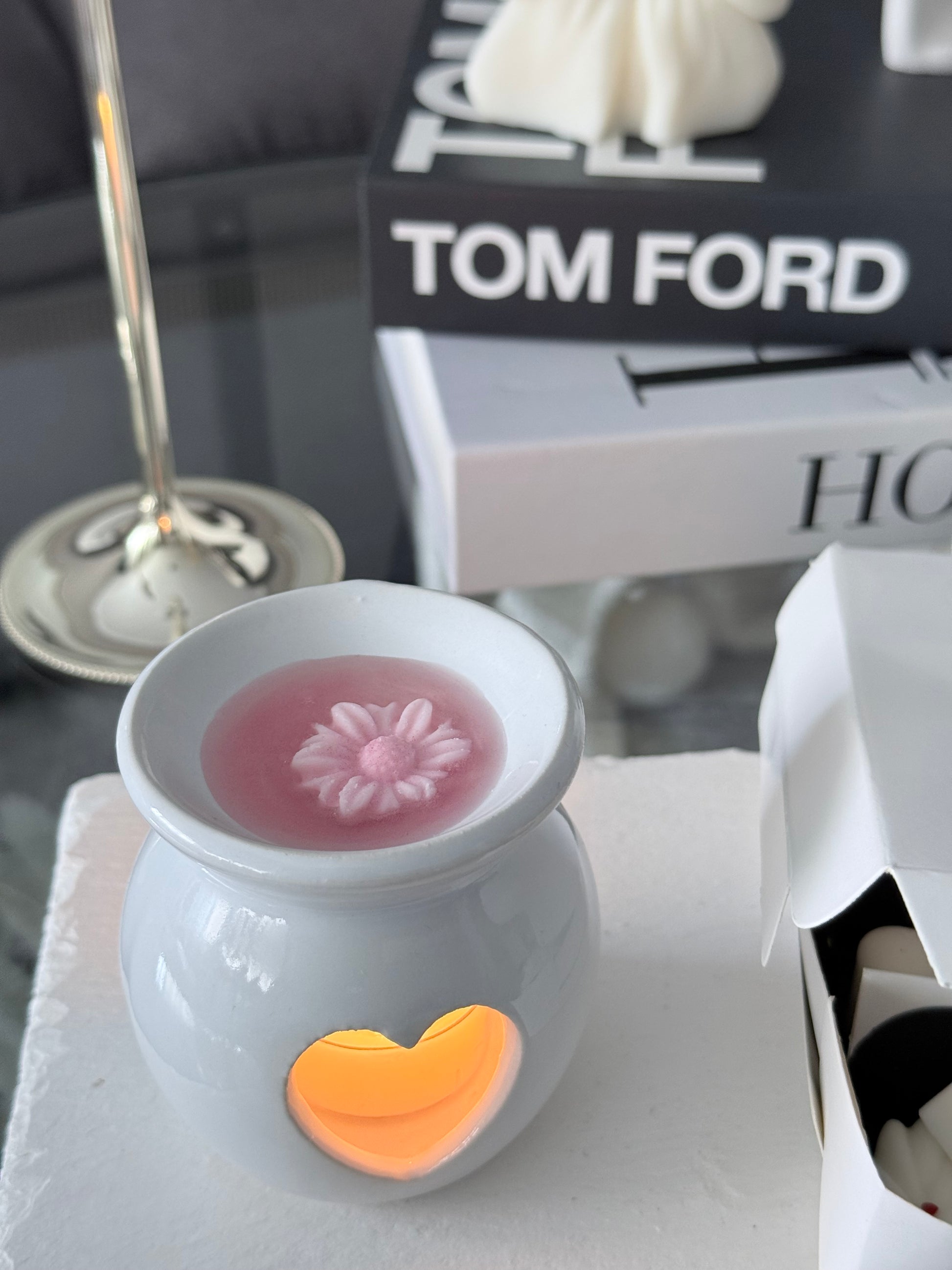 Coloca una figurita de cera en el quemador y enciende la vela base. Al derretirse, el aroma envolverá tu espacio.