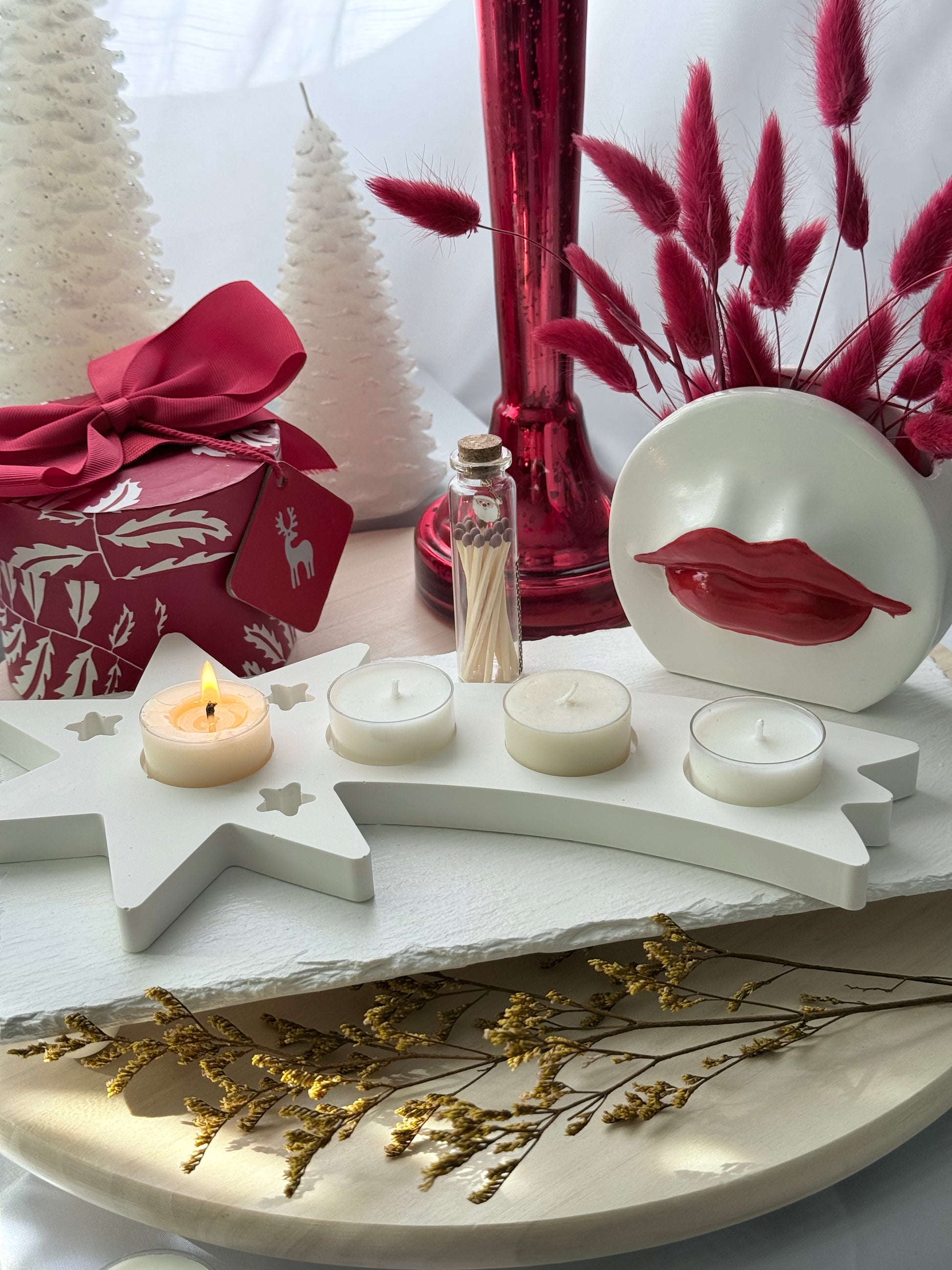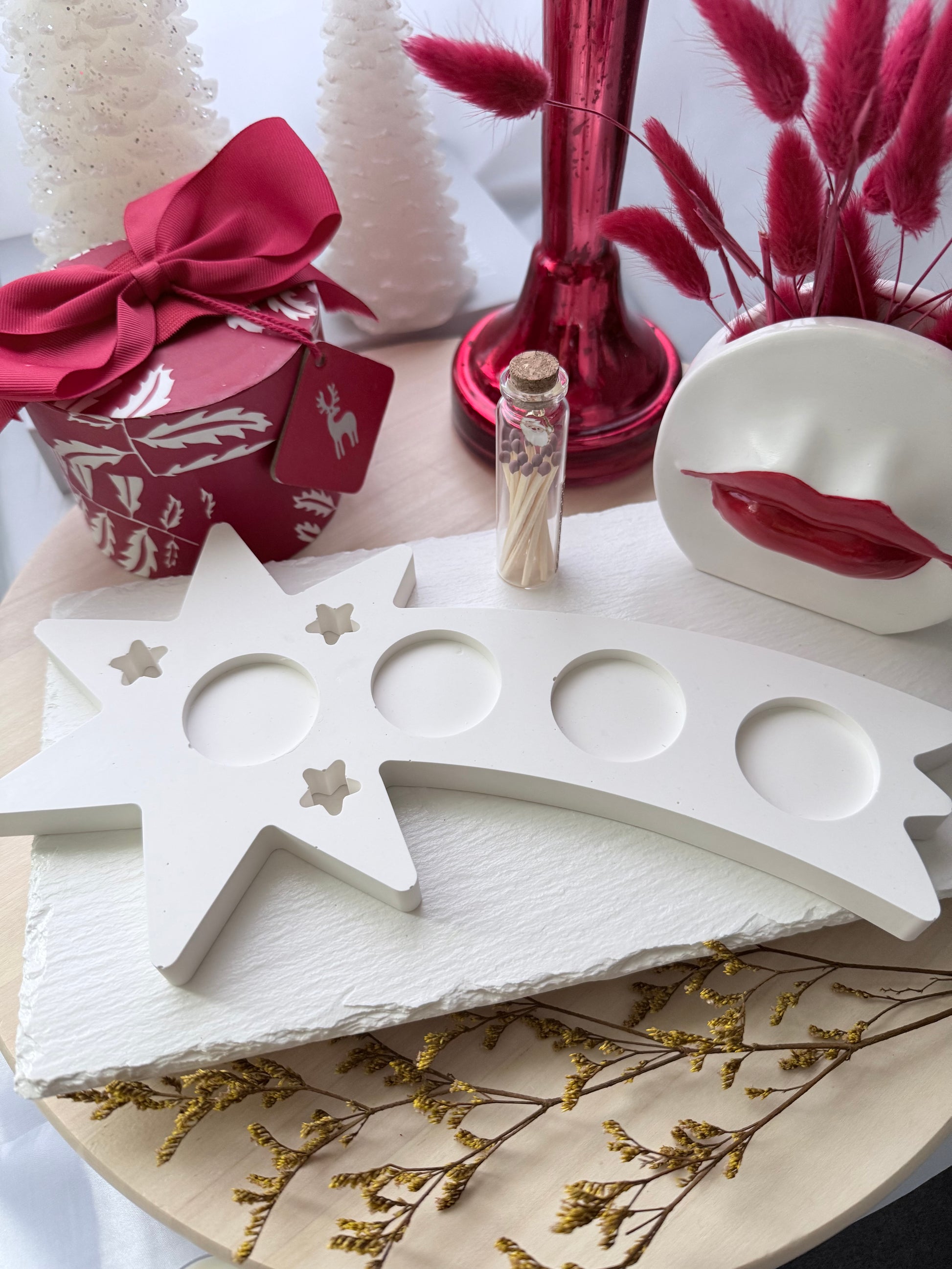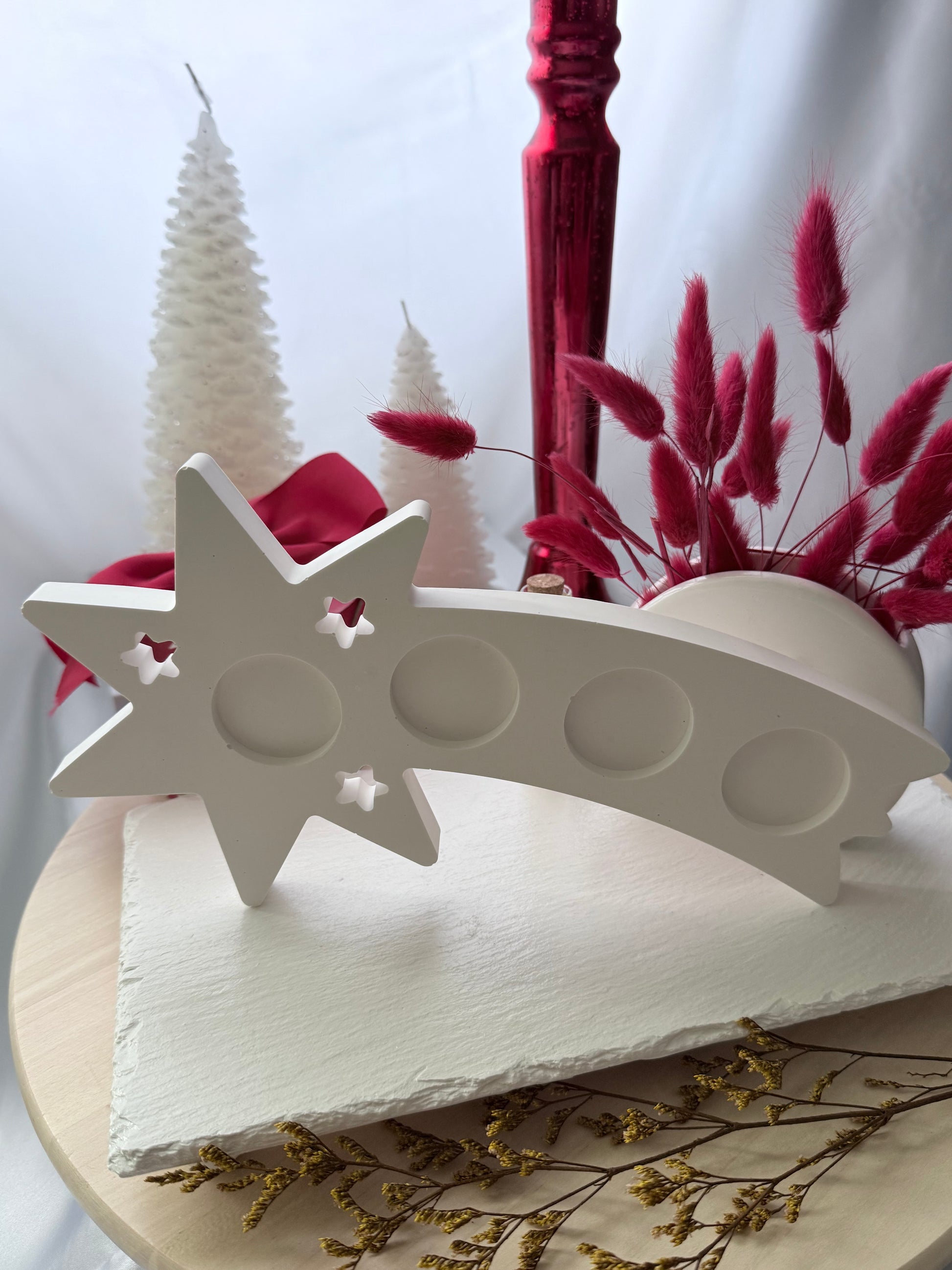 Esta pieza decorativa con forma de estrella fugaz está elaborada completamente a mano con resina ecológica, lo que la hace una opción sostenible y única para tu hogar. Su acabado blanco suave y las cavidades circulares la convierten en un accesorio ideal para velitas tipo tealight o pequeñas decoraciones. Cada detalle —incluyendo las diminutas estrellas recortadas— refleja un trabajo cuidado y artesanal. Perfecta para ambientar espacios festivos, rincones especiales o como un regalo personalizado lleno de estilo y encanto natural.