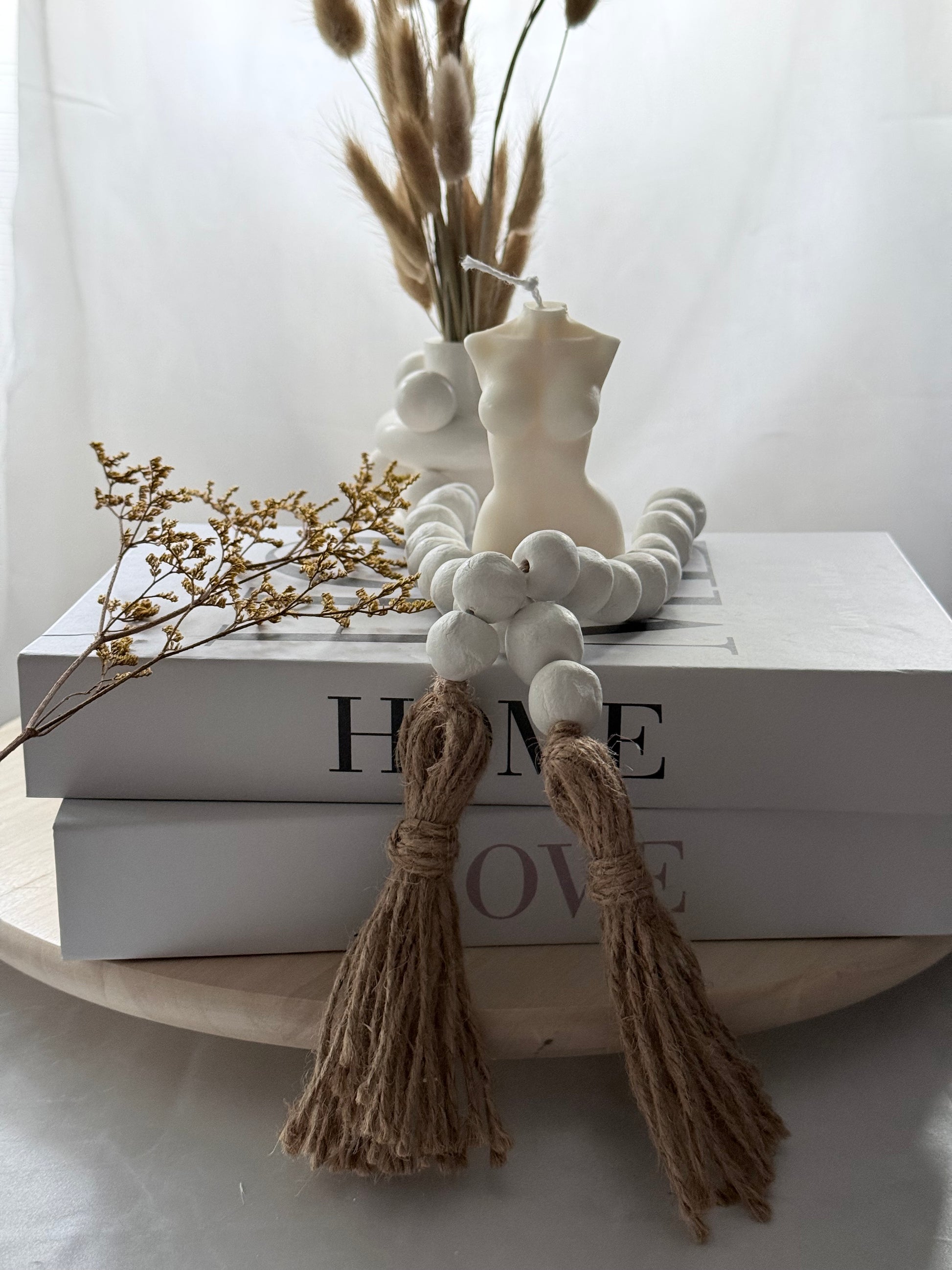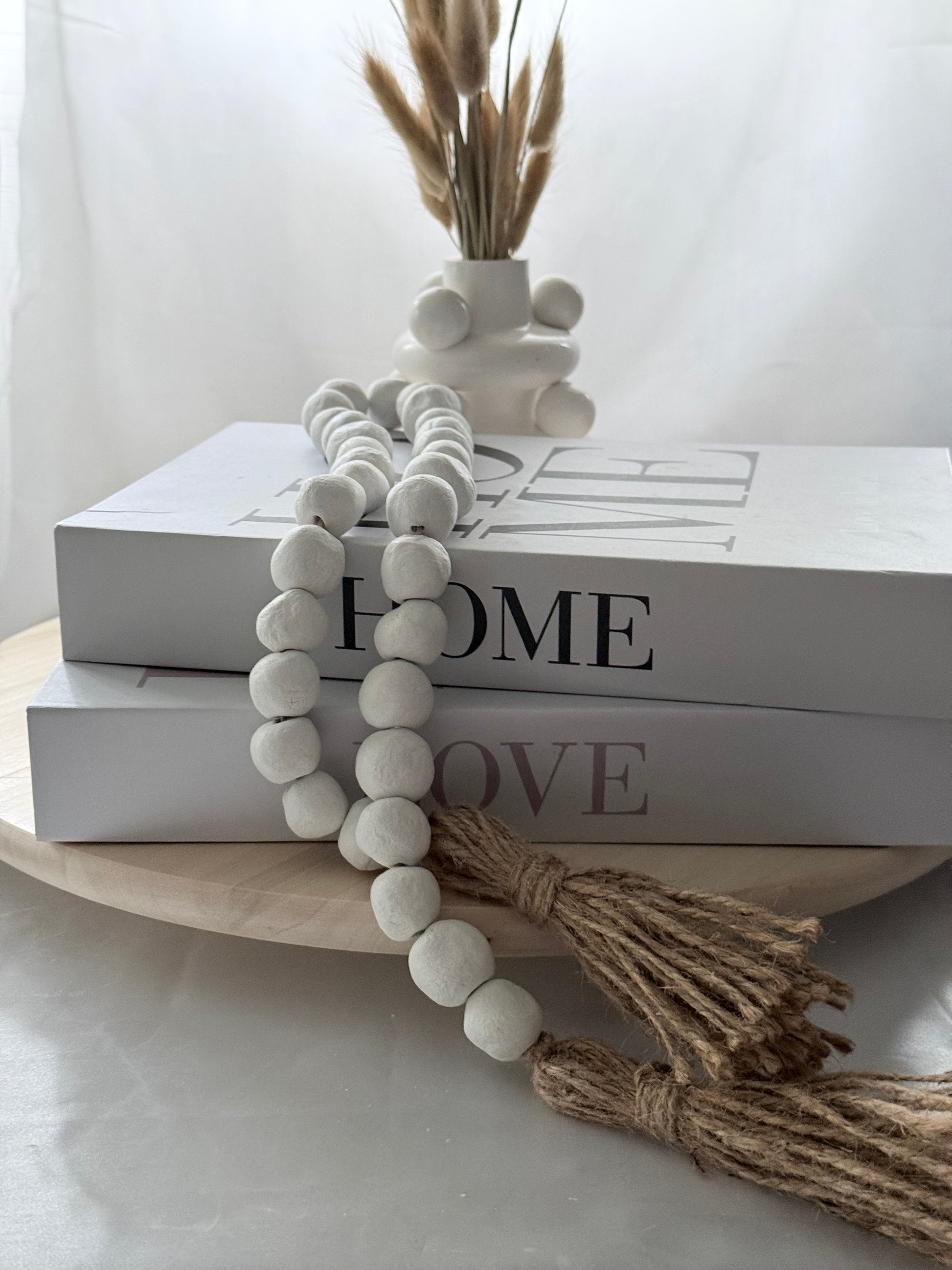 Elegancia artesanal para tu hogar. Esta guirnalda está hecha a mano con delicadas bolas de cerámica fría en tono blanco mate, unidas y rematadas con borlas de yute natural. Su estilo minimalista y versátil la convierte en el complemento ideal para decorar mesas de centro, estanterías, bandejas o libros decorativos. Un detalle único que aporta calidez y un toque rústico-chic a cualquier espacio.