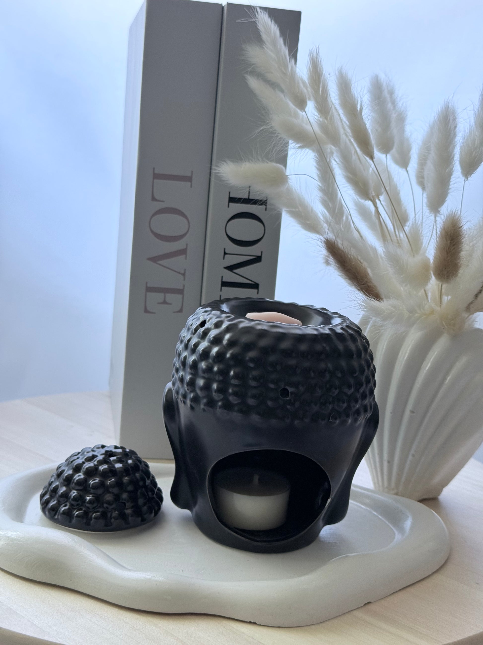 Quemador de cerámica negra con forma de cabeza de Buda, ideal para crear un ambiente de calma y equilibrio. Perfecto para usar con aceites esenciales o ceras aromáticas y aportar un toque espiritual y elegante a tu espacio.
