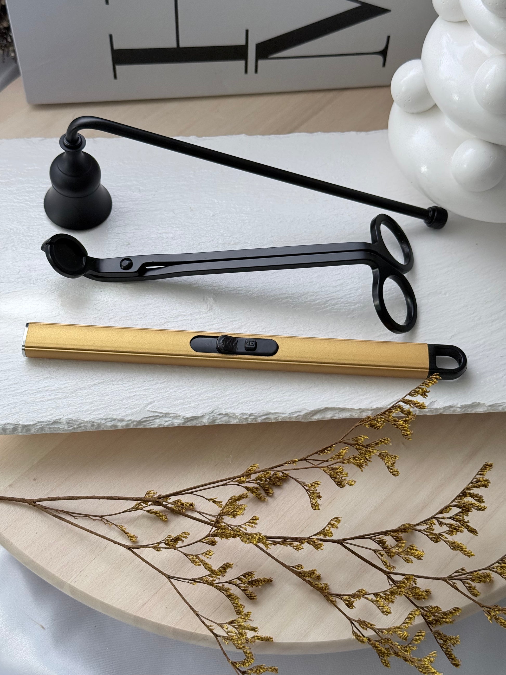 Un elegante set de accesorios que combina el negro mate con detalles dorados para un estilo contemporáneo y sofisticado. Incluye un apagavelas de brazo largo para extinguir la llama sin humo, un cortapabilo que mantiene la mecha en la medida perfecta y un encendedor recargable eléctrico de acabado dorado. Ideal para quienes buscan funcionalidad y diseño en su ritual de encendido y mantenimiento de velas.