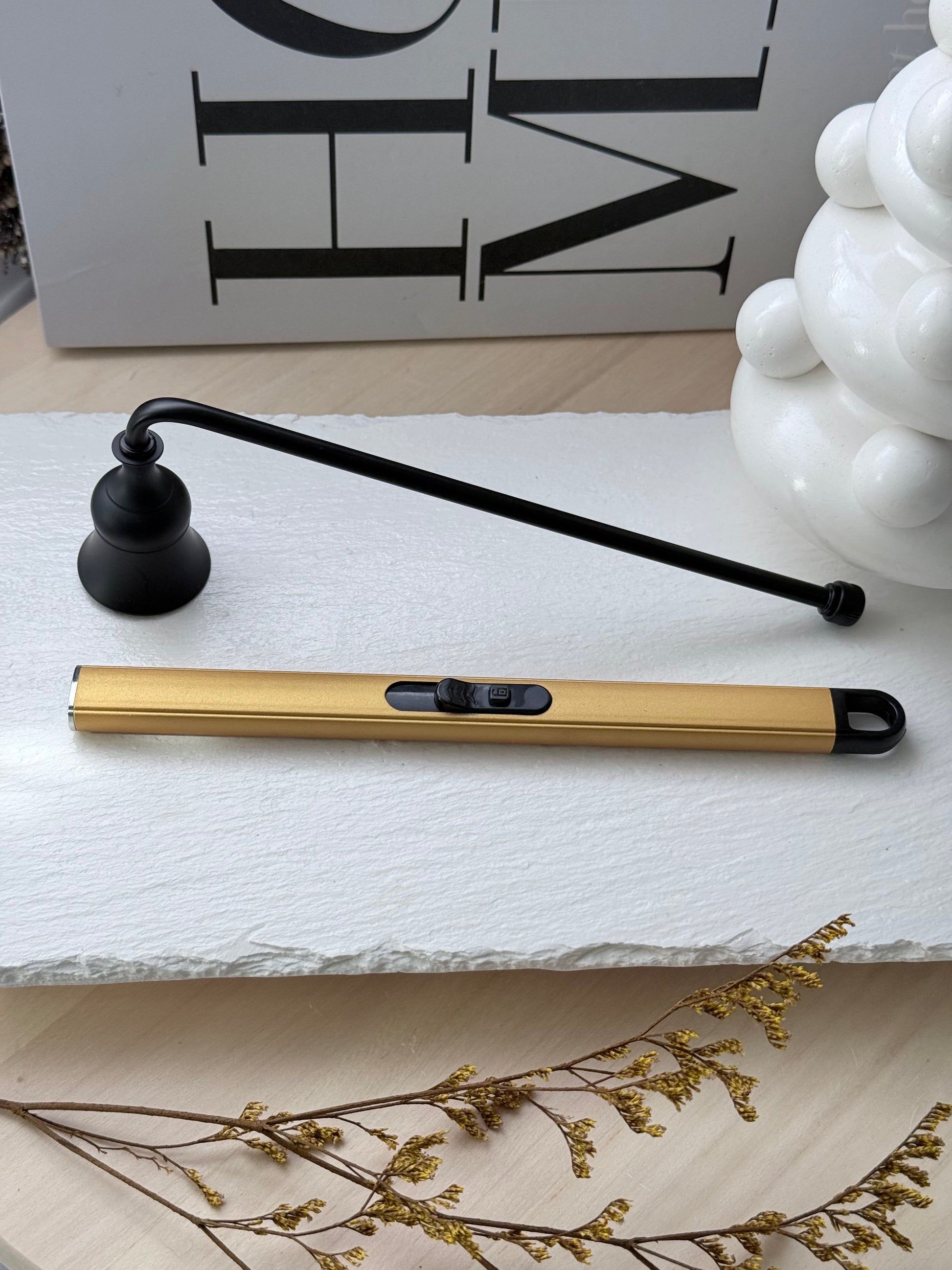 Conjunto contemporáneo que combina elegancia y funcionalidad. Incluye un apagavelas en acabado negro mate para extinguir la llama de forma segura y sin humo, acompañado de un encendedor recargable eléctrico dorado que aporta un toque sofisticado. Perfecto para quienes buscan mantener sus velas con estilo y disfrutar de una experiencia cálida y cuidada en el hogar.