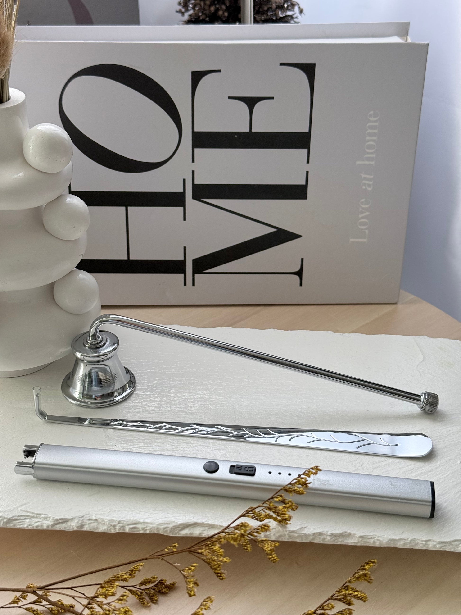 Refinado conjunto de accesorios en acabado plateado, ideal para mantener tus velas en perfectas condiciones. Incluye un apagavelas clásico para extinguir la llama sin producir humo, un enderezador de mecha con grabado decorativo y un encendedor recargable eléctrico en tono plateado a juego. Un set funcional y elegante que aporta un toque contemporáneo y sofisticado a tus momentos de bienestar en casa.