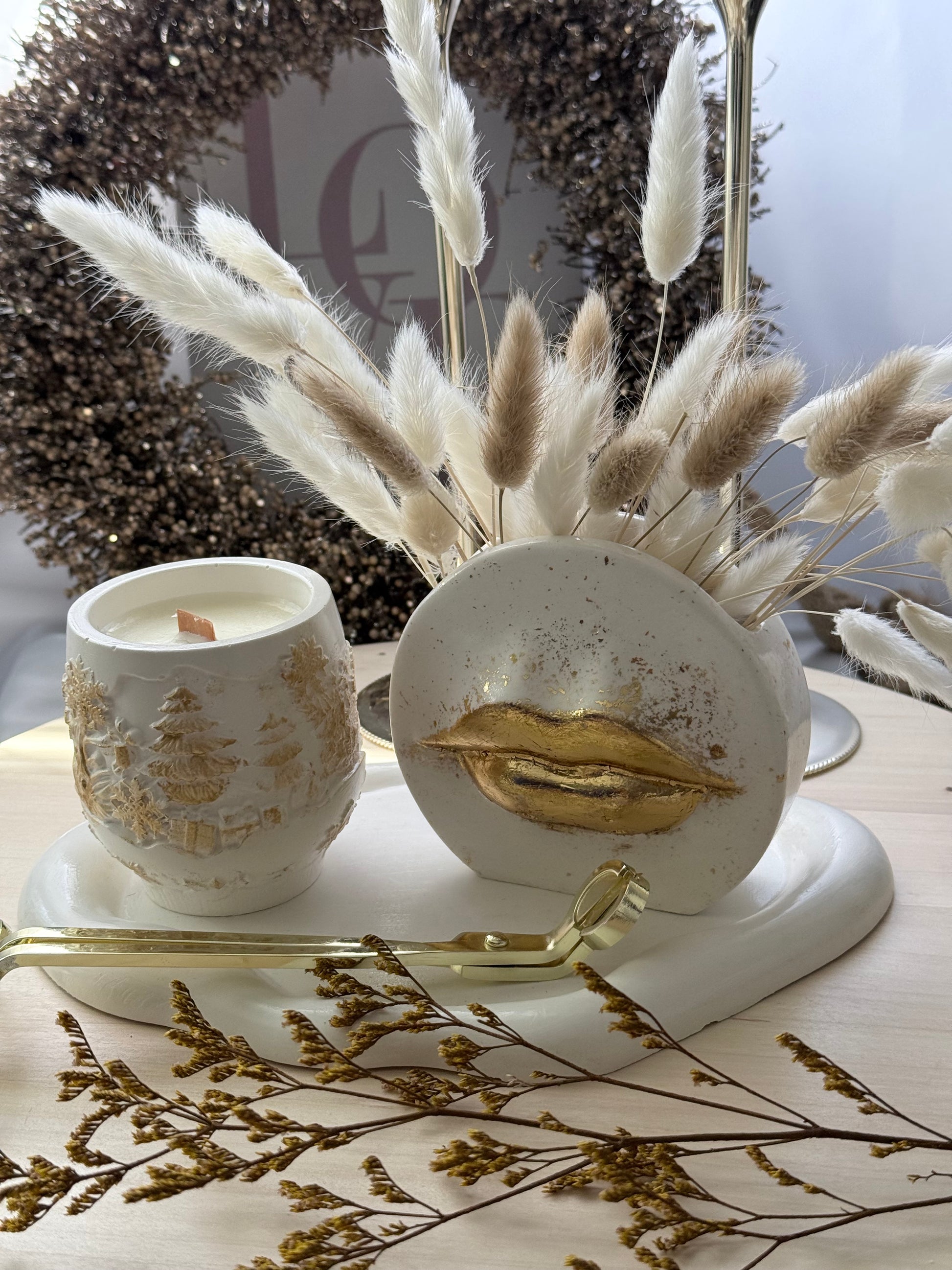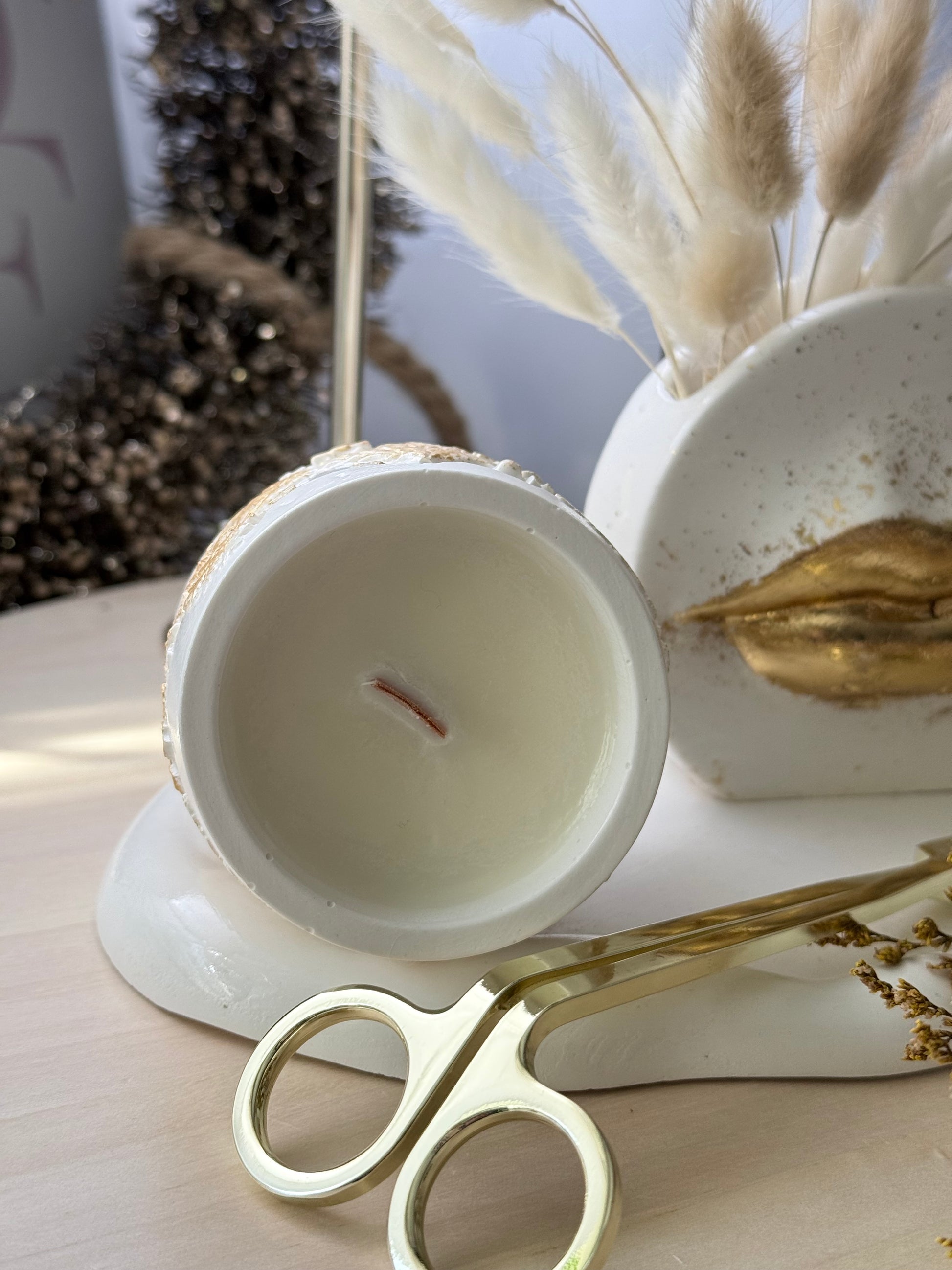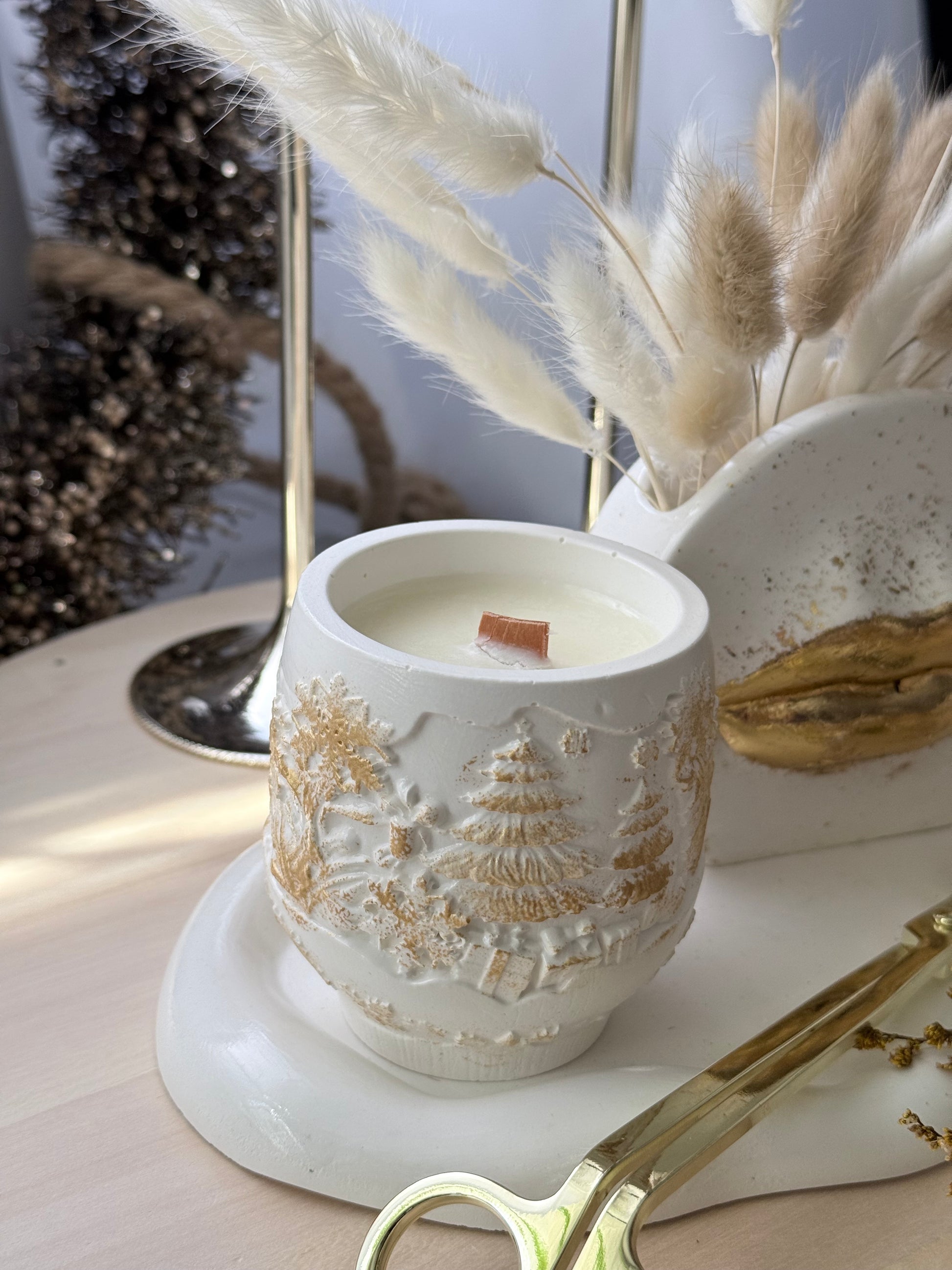 Una vela artesanal en un elegante recipiente de resina blanca con relieves dorados que evocan paisajes navideños llenos de encanto. Su diseño combina la calidez de la temporada con un estilo sofisticado y sereno. Perfecta para iluminar el hogar durante las fiestas, aportando un toque de elegancia, paz y magia navideña en cada rincón.
