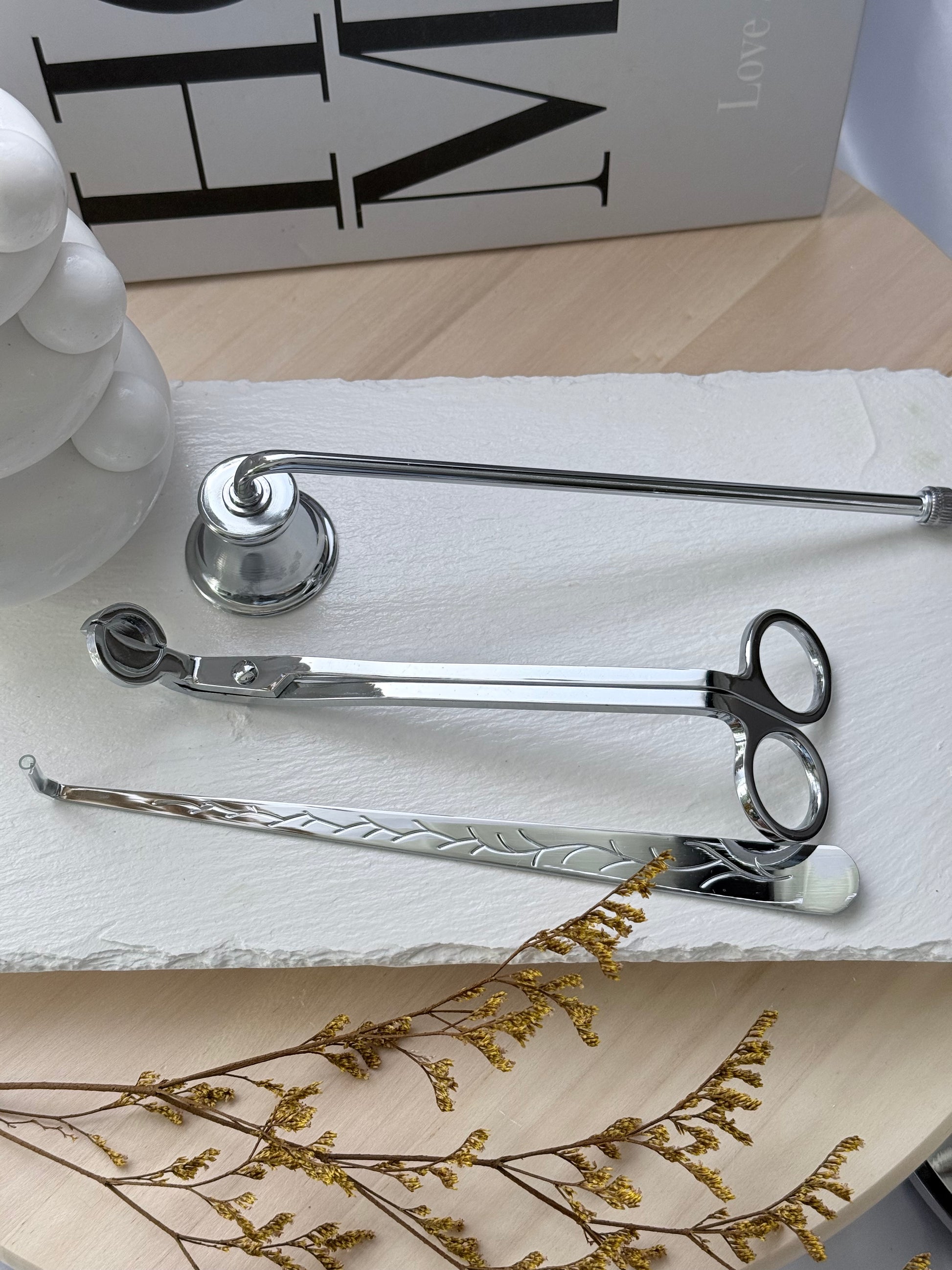 Elegante set de accesorios en acabado plateado brillante, ideal para mantener tus velas siempre impecables. Incluye un apagavelas para extinguir la llama sin humo, un cortapabilo que ayuda a mantener la mecha a la longitud perfecta y un enderezador de mecha que facilita su reposicionamiento después de apagarla. Un conjunto funcional y decorativo que combina estilo moderno con practicidad para realzar tus momentos de relajación.