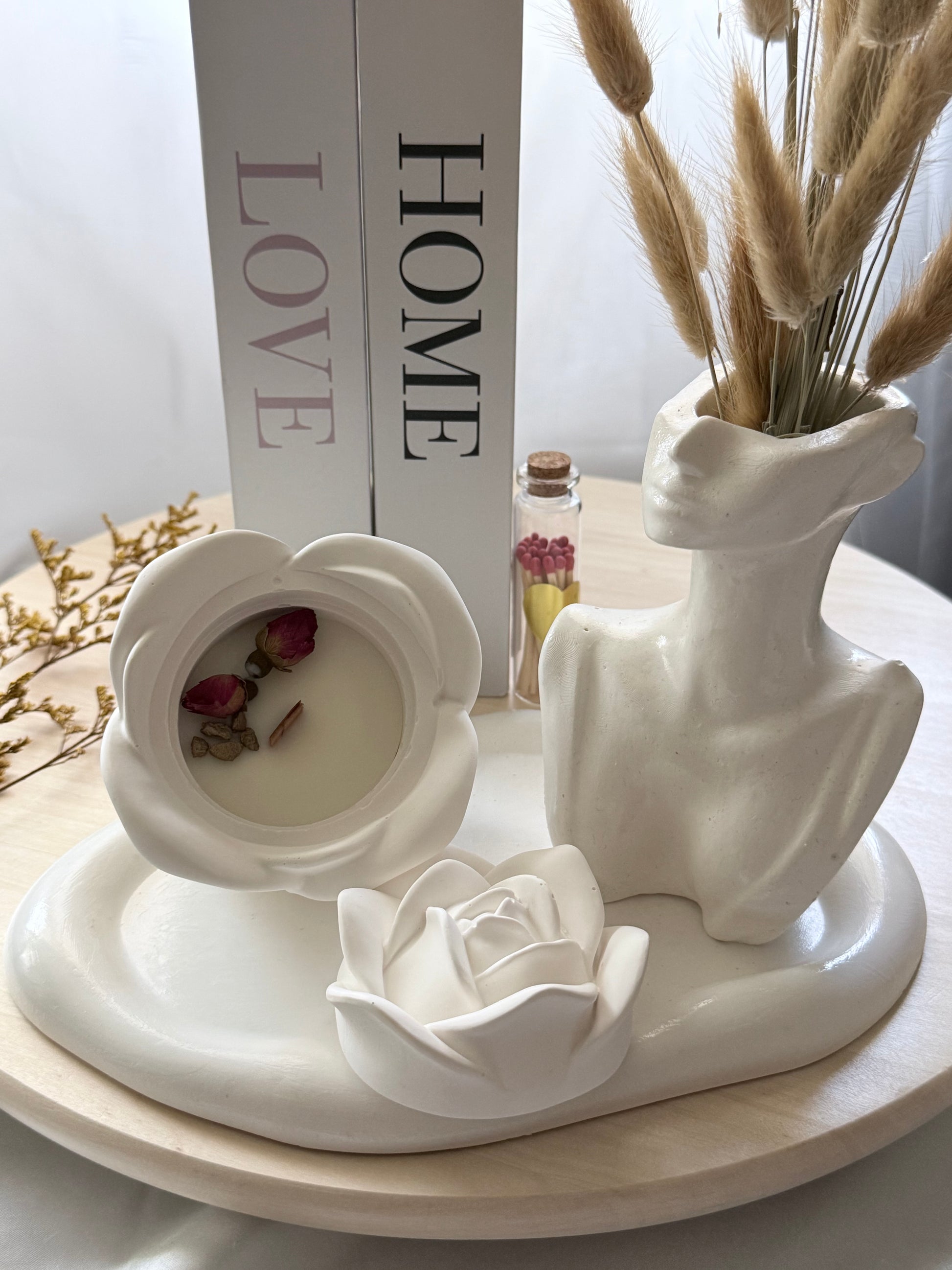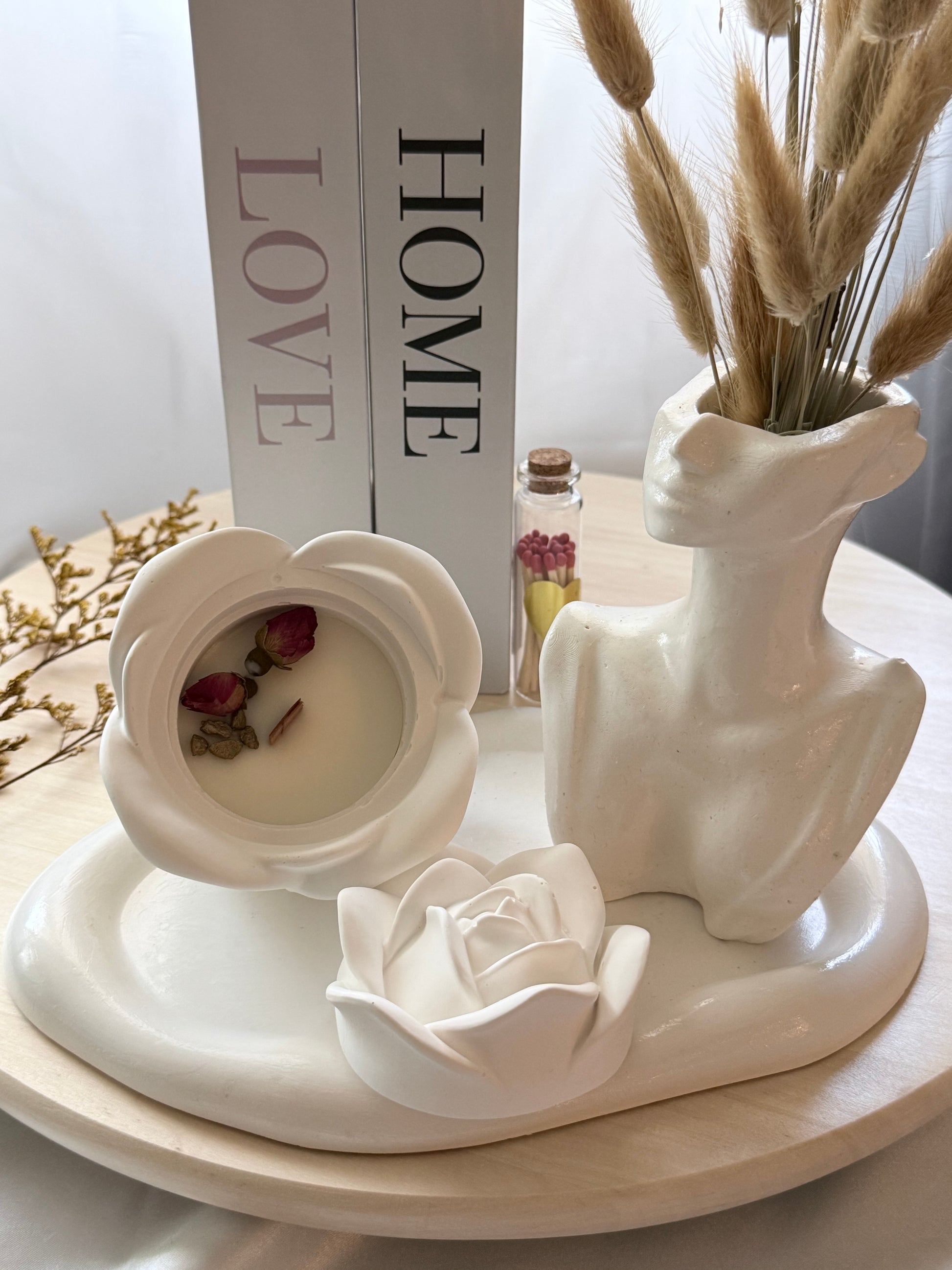 Una pieza elegante y delicada que combina arte y aroma. Esta vela hecha a mano está elaborada con cera natural y resina ecológica, diseñada en una romántica forma de flor que simboliza la belleza y la calma. Su fragancia de rosa fresca evoca serenidad y armonía, llenando cualquier espacio con un toque floral y sofisticado.