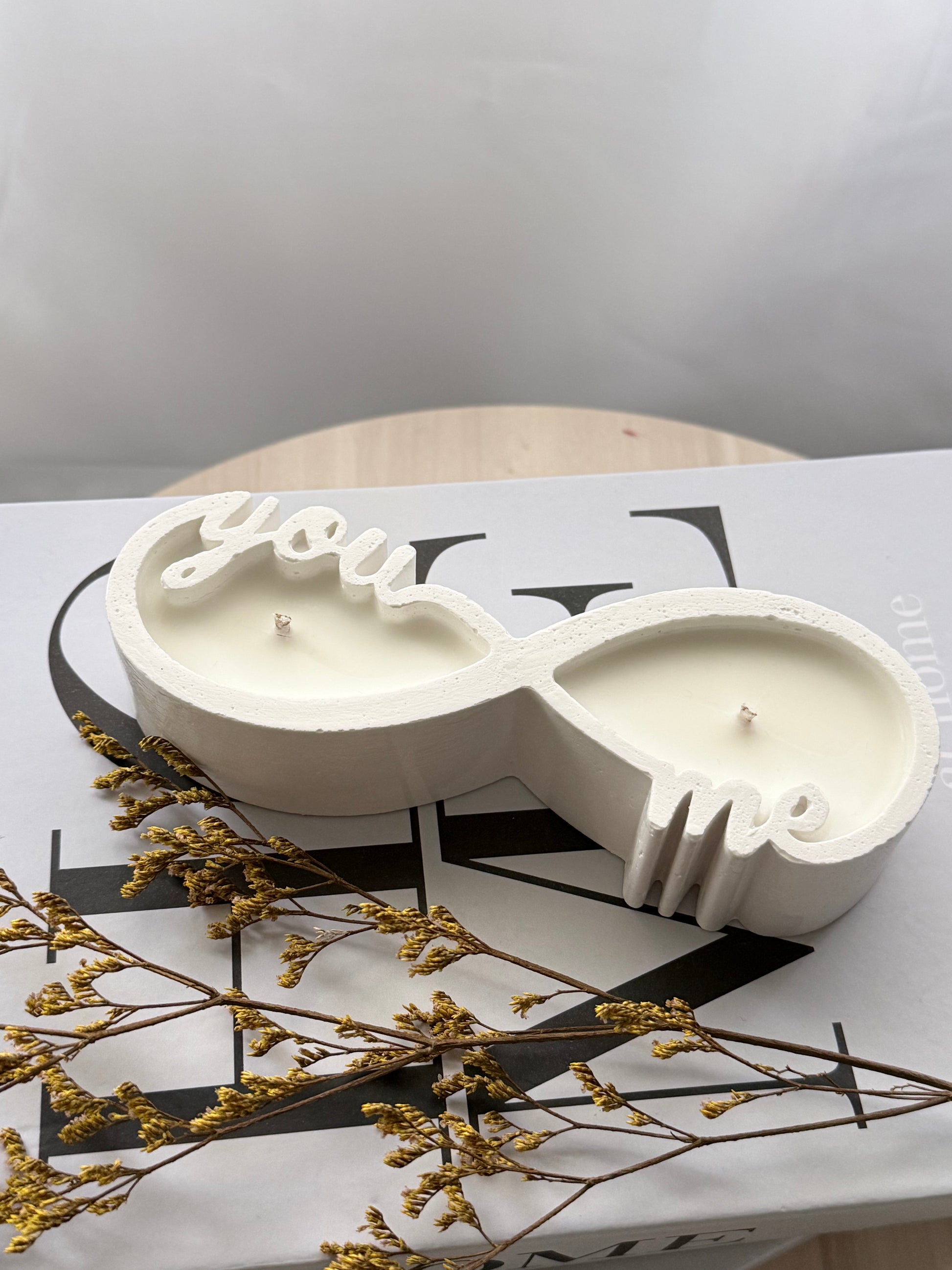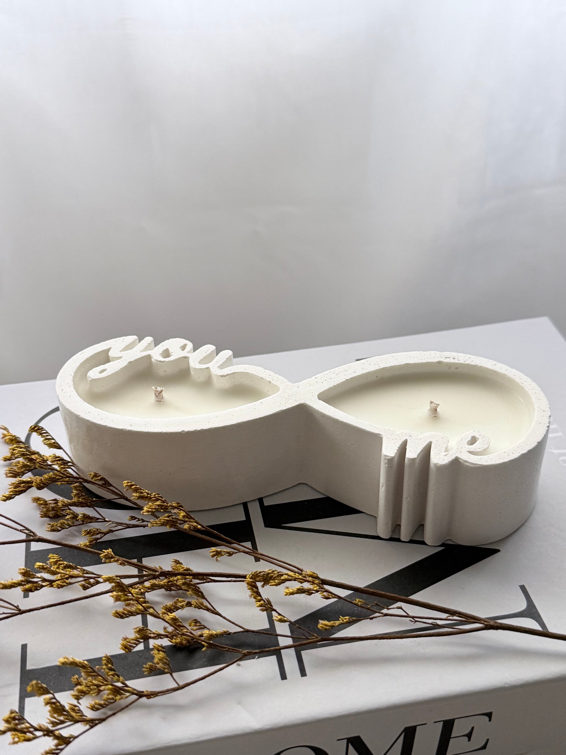 Una vela que celebra la unión eterna. Hecha a mano con cera natural y resina ecológica, su diseño en forma de infinito con las palabras “you” y “me” simboliza un amor sin límites.