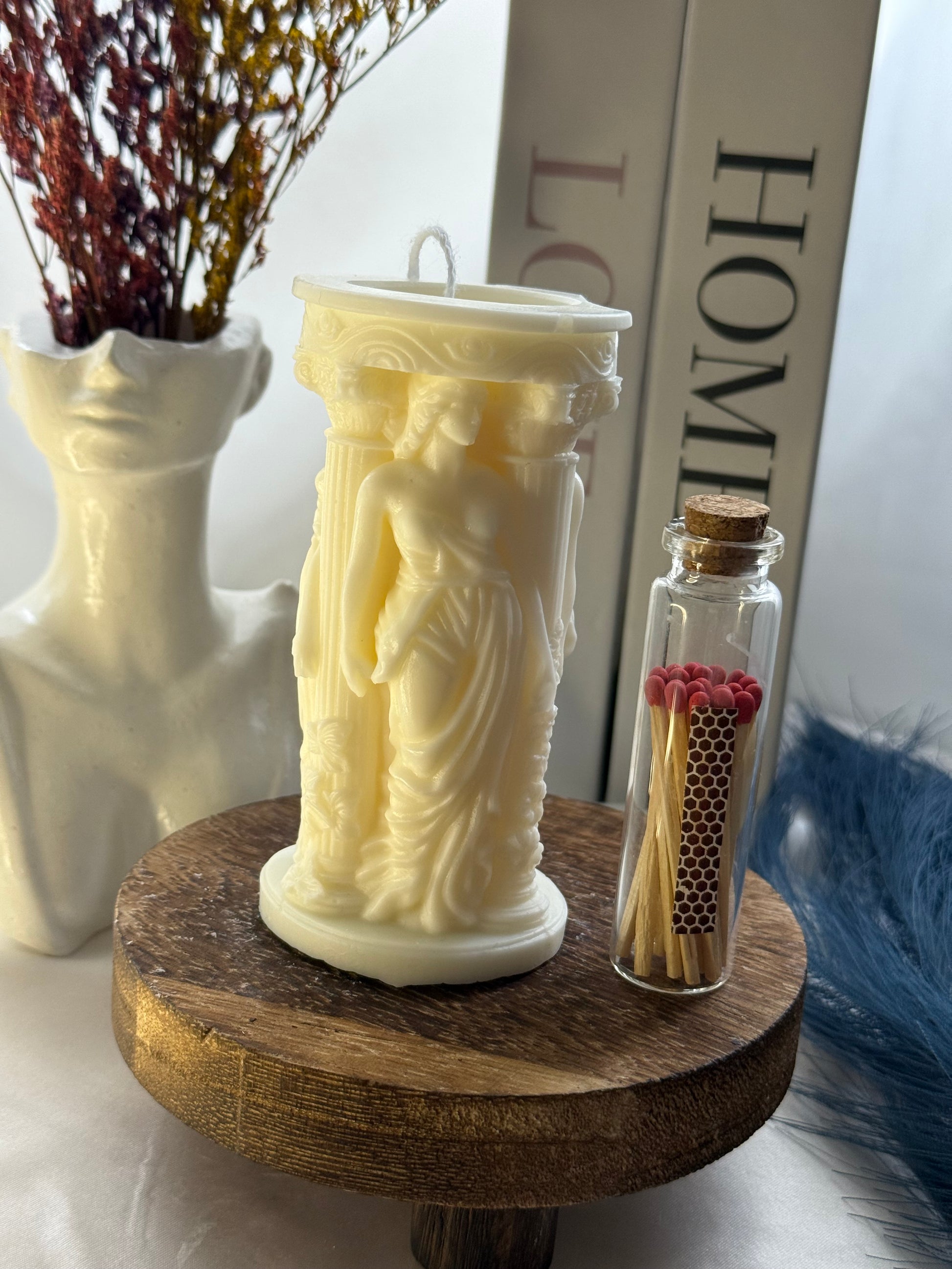 Vela escultórica elaborada en cera de alta calidad, con un diseño grecorromano que representa a una diosa rodeada de columnas. Ideal para decorar, regalar o ambientar espacios con un toque sofisticado y distintivo.