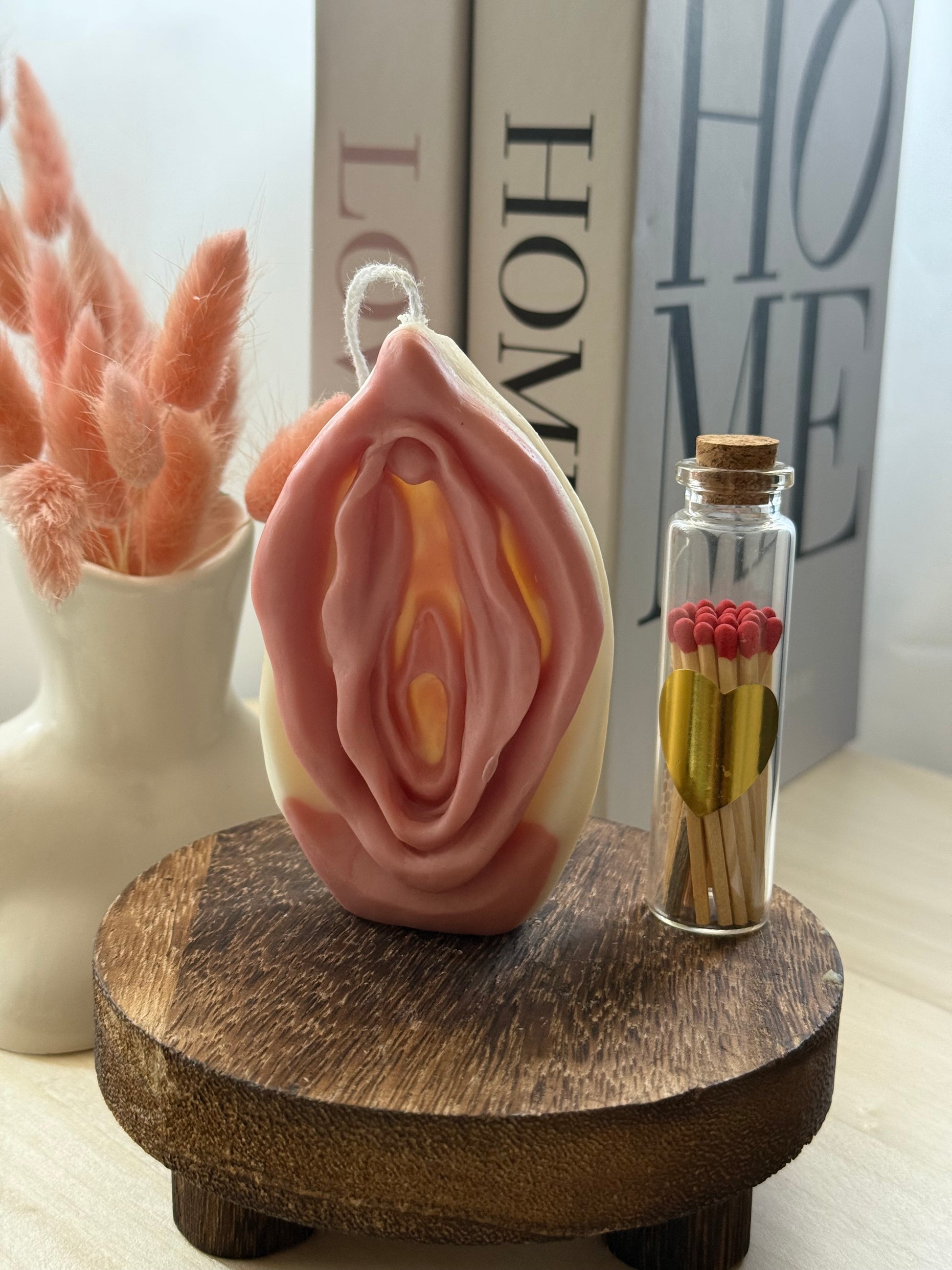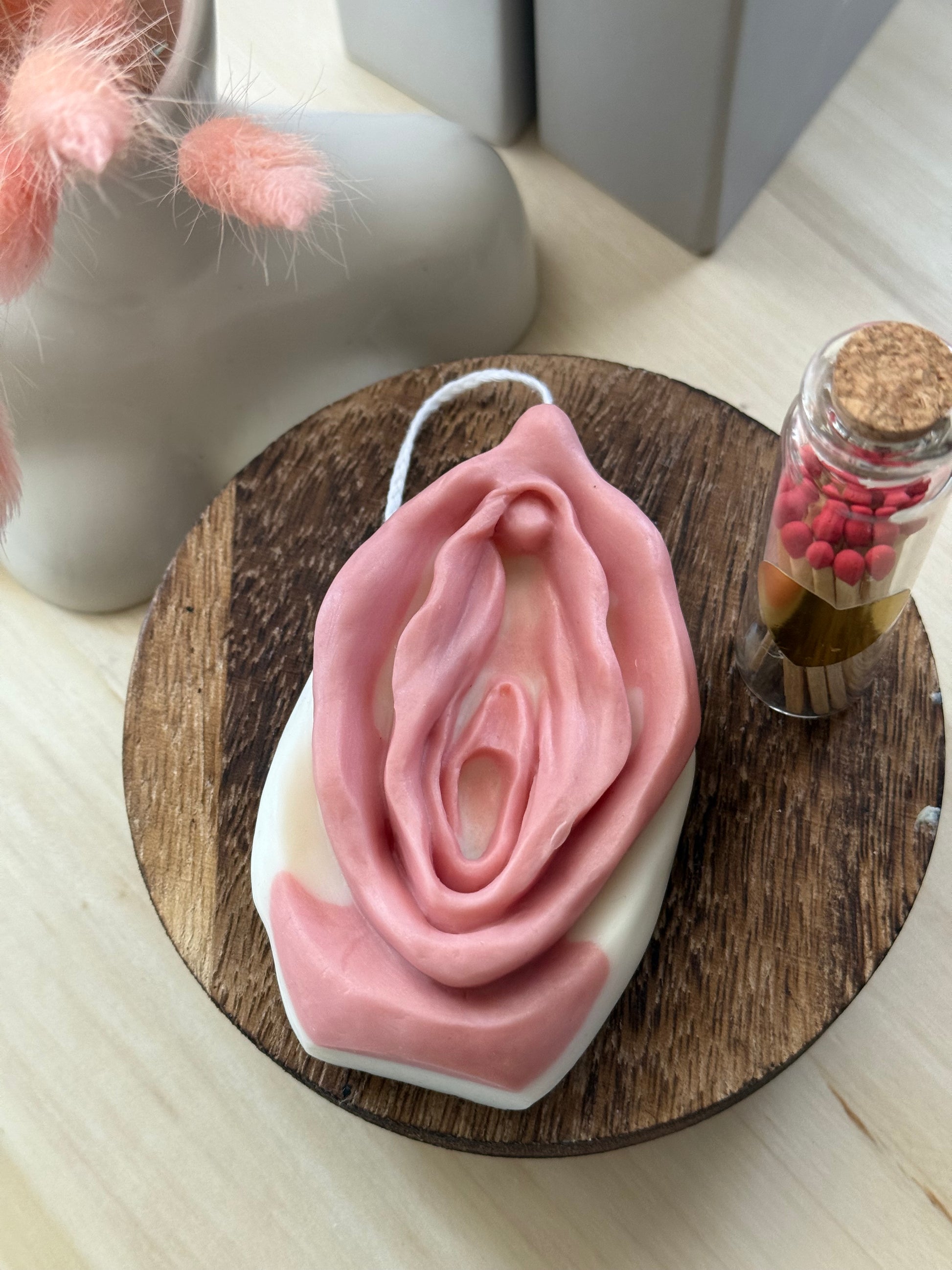 Esta vela artesanal, inspirada en la forma de la vulva, representa el portal de la vida, la energía creadora y el poder de lo femenino sagrado.