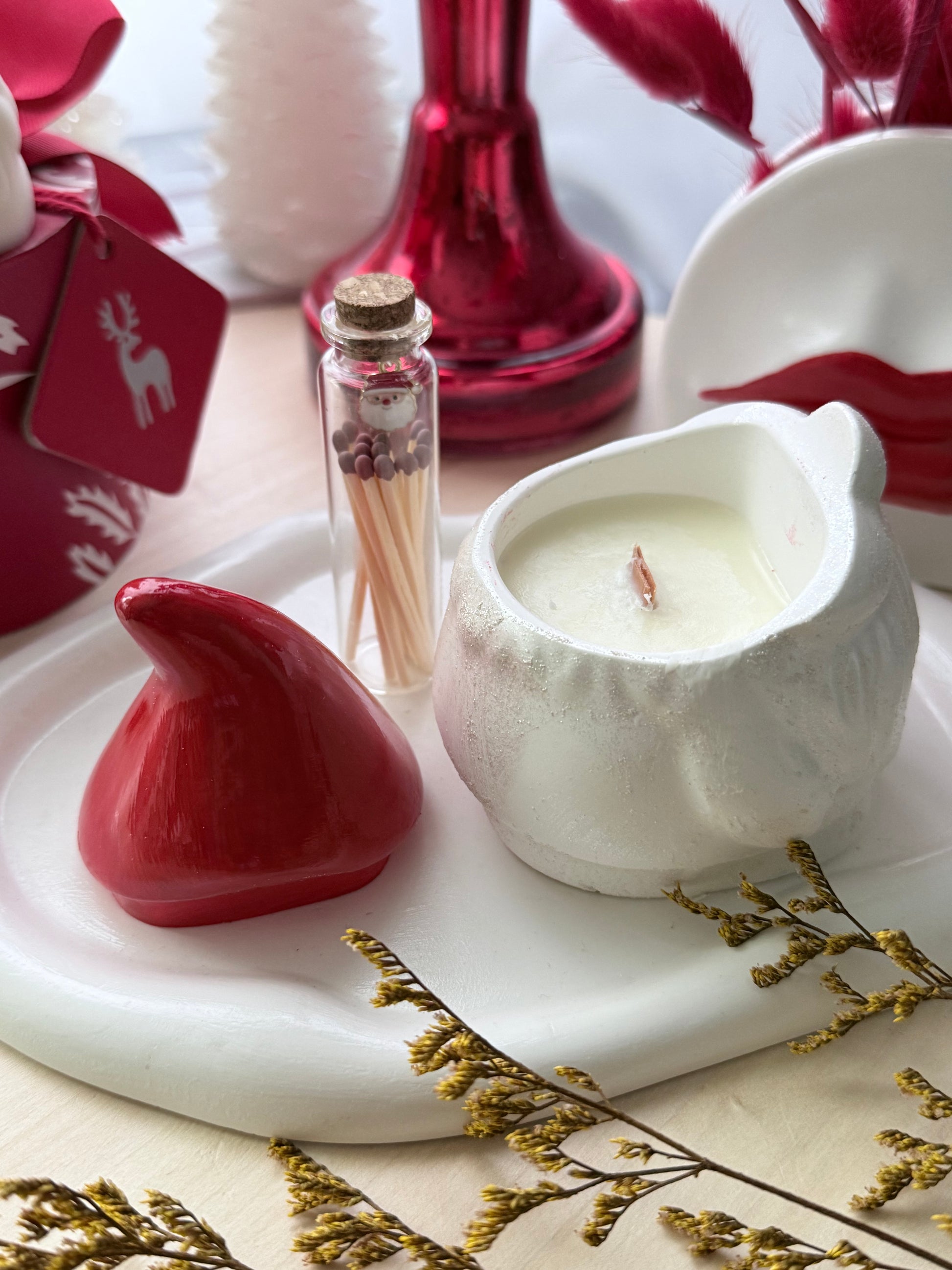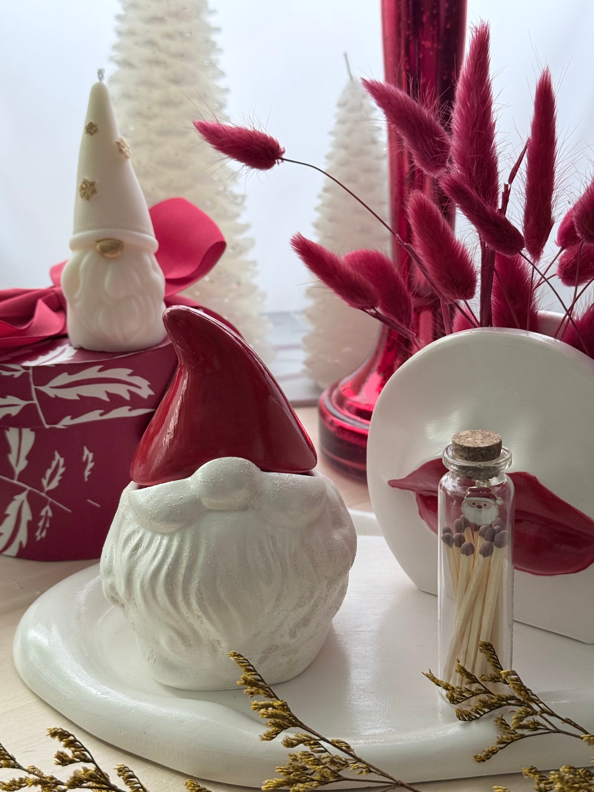 La Vela Santa Elegante es una pieza artesanal creada con cera de soja natural y diseñada para aportar encanto y calidez a tu decoración navideña. Su acabado blanco perlado con detalles brillantes y su característico gorro rojo dan vida a un Santa moderno y decorativo.